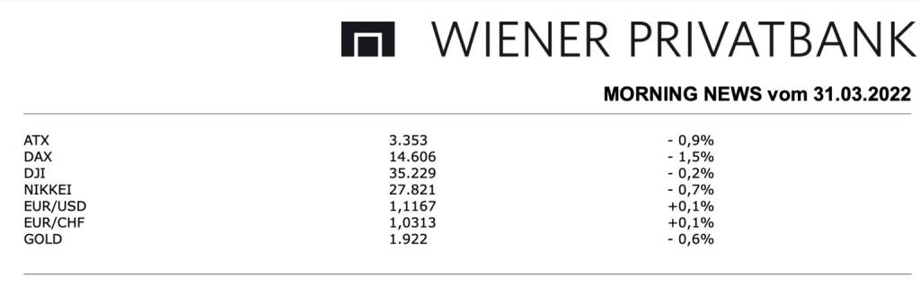 Aus den Morning News der Wiener Privatbank: Die Wiener Börse musste zur Wochenmitte nach dem starken Vortag wieder nachgeben, der ATX erlitt eine Einbuße von 0,9%. Enttäuschung gab es nach den am Vortag erweckten Hoffnungen im Ukraine-Krieg, da die Moskauer Seite gestern davon sprach, dass noch kein Durchbruch erzielt werden konnte. Gegenwind gab es auch durch die gestern vorgelegten Inflationszahlen, diese ist in Deutschland auf den höchsten Wert seit der Wiedervereinigung gestiegen, zugleich wurden die Konjunkturprognosen deutlich gesenkt, jetzt wird für heuer nur mehr ein Wachstum von 1,8% erwartet, noch im November des letzten Jahres war diese Prognose bei 4,6% gelegen. Unternehmensseitig stand zur Wochenmitte FACC im Fokus, der Luftfahrtzulieferer hat das Geschäftsjahr 2021 erneut mit einem Verlust abgeschlossen, wie schon in den vorläufigen Zahlen angedeutet worden war, die Aktie konnte dadurch, dass dieses Ergebnis nicht überraschend kam, gestern um 0,5% zulegen. Raiffeisen Research kürzte das Kursziel für Semperit von 33,5 Euro auf 28,5 Euro, bestätigte aber die Kaufempfehlung, für den Gummikonzern ging es um 0,4% nach unten. Einen schwachen Tag gab es für die Banken, die Bawag musste 2,8% abgeben, für die Erste Group ging es um 1,0% nach unten, die Raiffeisen Bank International verzeichnete ein Minus von 1,6% und auch die kleinere Addiko Bank musste 1,3% schwächer aus dem Handel gehen. Nachgeben mussten auch die Ölwerte, für die OMV gab es einen Rückgang von 2,6%, Schoeller-Bleckmann konnte sich im Vergleich dazu mit einem Abschlag von 0,8% deutlich besser halten. Schwächster Wert des gestrigen Tages war Lenzing, für den Faserhersteller gab es ein Minus von 4,4%, auch Palfinger wurde verkauft, der Kranhersteller ging mit einer 3,8% tieferen Notierung aus dem Handel. Bester Titel am gestrigen Tag war der Verbund, der sich um 5,1% verbessern konnte, auch Rosenbauer war wieder gut nachgefragt, für den Feuerwehrausrüster ging es um 3,4% nach oben. Der Flughafen Wien konnte ebenfalls zulegen und mit einem Plus von 1,3% schliessen, auch Frequentis zählte zu den Gewinnern, der Softwareanbieter konnte um 1,1% vorrücken.