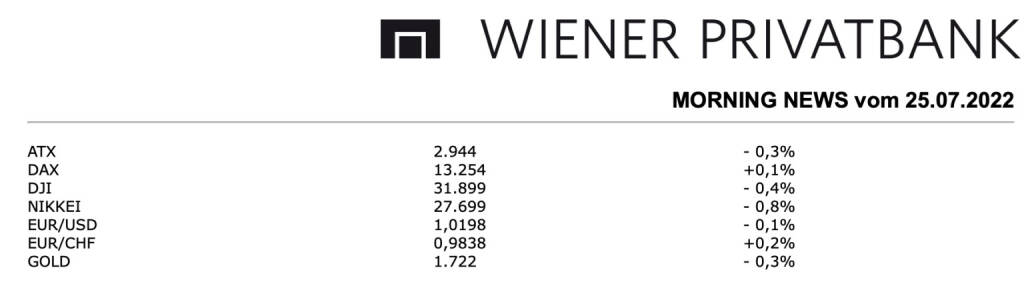 Aus den Morning News der Wiener Privatbank: Die Wiener Börse ist am Freitag etwas schwächer aus dem Handel gegangen, der ATX schloss mit einem Minus von 0,3%, was auf Wochensicht gesehen einen Zuwachs von 2,0% bedeutete, am Nachmittag hatten enttäuschende Konjunkturdaten aus den USA die Anlegerstimmung etwas getrübt. Bereits am Vormittag wurden die Einkaufsmanagerindices in Europa unter den Erwartungen gemeldet, wovon sich die Märkte aber relativ rasch erholen konnten. Ansonsten blieb die Meldungslage zu den einzelnen Unternehmen wieder einmal sehr dünn, es gab so gut wie keine signifikanten Meldungen, auch von Analystenseite gab es keine neuen Mitteilungen. Die im Index schwergewichteten Banken zeigten eine unterschiedliche Tendenz, die Bawag konnte um 0,9% zulegen, die Erste Group musste 2,8% nachgeben und auch für die Raiffeisen Bank International ging es um 1,8% nach unten. Auch bei den Ölwerten gab es eine gemischte Stimmung, während Schoeller-Bleckmann gesucht war und um weitere 2,0% zulegen konnte, hatte OMV einen schwachen Tag und erlitt einen Rückgang von 1,8%. Unklar bleibt die Situation um Warimpex, anscheinend wurde sie vom Nachrichtendienst Bloomberg auf Grund des hohen Russland-Exposures auf die Liste der sanktionierten Werte gesetzt, wodurch sie bei allen auf diesem System basierenden Handelssystemen derzeit nicht handelbar ist, was den Umsatz in diesem Titel naturgemäß stark einschränkt. Schwächster Wert des Handels zum Wochenausklang war Lenzing, der Faserhersteller verzeichnete ein Minus von 3,6%, auch Palfinger war wenig beliebt, der Kranhersteller musste 3,0% nachgeben. An die Spitze der Kursübersicht konnte sich Zumtobel setzen, der Leuchtenhersteller durfte sich über eine Verbesserung von 4,5% freuen, auch die Versorger waren in dem europaweit starken Sektorenumfeld gesucht, für EVN ging es um 2,3% nach oben, der Verbund verzeichnete einen Anstieg von 2,1%. Am Donnerstag werden OMV, Verbund und Amag über die Ergebnisse deszweiten Quartals berichten, am Donnerstag sind Andritz, Palfinger und ams-OSRAM an der Reihe.