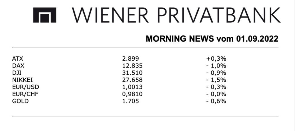 Aus den Morning News der Wiener Privatbank: Die Wiener Börse konnte den Mittwoch mit Gewinnen beenden, der ATX endete nach einem Handel mit mehreren Vorzeichenwechseln letztendlich mit einem Plus von 0,3%, auf das gesamte Monat gesehen bedeutete das aber dennoch einen Rückgang von 4,1%. Der August war geprägt von Inflations-, Zins- und letzten Endes auch Konjunktursorgen, vor diesem Hintergrund standen nun die Eurozonen-Inflationszahlen im Fokus, die Verbraucherpreise stiegen um 9,1%, das ist die höchste Rate seit Bestehen des Euro, die Markterwartungen wurden damit leicht übertroffen. Das bestärkte viele Marktteilnehmer in ihrer Ansicht, dass bei der nächsten Sitzung der EZB eine Anhebung des Leitzinses um 0,75 Basispunkte erfolgen wird. Vor diesem Hintergrund konnten die Bankentitel zulegen, die Bawag verzeichnete einen Anstieg von 1,6%, für die Erste Group ging es um 0,6% nach oben und die Raiffeisen Bank International schaffte eine Verbesserung von 1,8%.