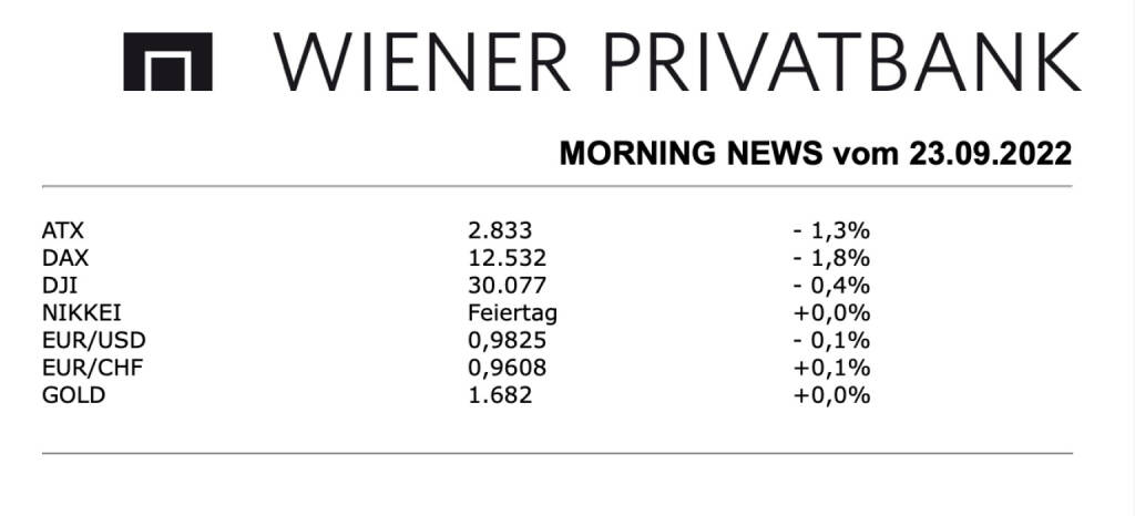 Aus den Morning News der Wiener Privatbank: Auch die Wiener Börse musste den Handel am Donnerstag im roten Bereich beenden, der ATX rutschte zum Ende hin um 1,3% nach unten. Auf die Stimmung der Investoren drückte vor allem die Furcht vor einer weiteren internationalen wirtschaftlichen Abschwächung aufgrund der steigenden Leitzinsen dies- und jenseits des Atlantiks. Bei den Einzeltiteln legte Agrana vorläufige Zahlen vor, der Zuckerkonzern hat sein operatives Ergebnis im ersten Halbjahr 2022/23 mehr als verdoppelt und den Umsatz um knapp 26 Prozent gesteigert, allerdings musste das Unternehmen weitere 91,3 Millionen Euro wegen des Ukraine-Kriegs außerordentlich abschreiben, die Aktie musste gestern 5,4% nachgeben. Raiffeisen Research bestätigte zwar die Kaufempfehlung für UBM Development, senkte aber gleichzeitig das Kursziel von 49,0 Euro auf 37,5 Euro, der Immobilienentwickler musste 1,3% nachgeben. Die A1 Telekom Austria warnte vor deutlich steigenden Kosten, das teilstaatliche Unternehmen zahlt in einem normalen Jahr hundert Millionen Euro für Strom, noch profitiert die Firma von günstigen Preisen, die sie sich im Voraus gesichert hat, doch diese Verträge laufen in den nächsten Monaten aus, die Aktie schloss prozentuell unverändert. Ans untere Ende der Übersicht rutschte bei sehr dünnen Umsätzen Warimpex, der Immobilienkonzern bleibt auf Grund des sehr schwachen Handelsvolumens weiter äußerst volatil und endete gestern mit einem Rückgang von 9,1%. Verkauft wurde auch AT & S, für den Leiterplattenhersteller brachte der Handel einen Rückgang von 4,5%. Eine gemischte Entwicklung gab es gestern für die Banken, die Bawag verzeichnete ein kleines Minus von 0,2%, für die Erste Group ging es wesentlich deutlicher um 2,1% nach unten, zulegen konnte hingegen die Raiffeisen Bank International, sie war mit einem Zuwachs von 1,5% auch gleichzeitig der stärkste Titel des gestrigen Handels. Ebenfalls zulegen konnte Kapsch TrafficCom, für den Mautsystemanbieter gab es eine Verbesserung von 0,8%, und auch OMV endete mit einem Plus, für den Ölkonzern ging es ebenfalls um 0,8% nach oben.