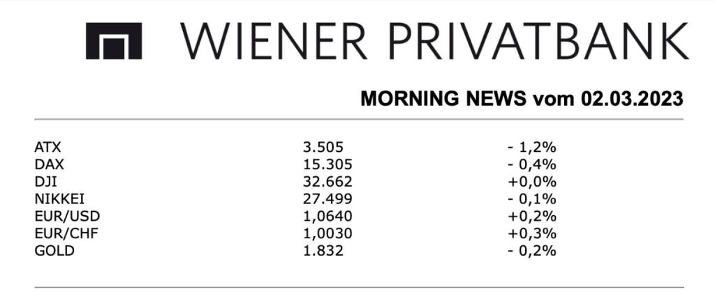 Aus den Morning News der Wiener Privatbank: "Die Wiener Börse hat am Mittwoch klar tiefer geschlossen. Der heimische Leitindex ATX gab um 1,19 Prozent auf 3.504,74 Punkte nach. An den europäischen Leitbörsen trübte sich im Verlauf die Stimmung ebenfalls merklich ein, nachdem überraschend hohe Inflationszahlen aus Deutschland publiziert worden waren. Die unerwartet hohen Verbraucherpreise in der führenden europäischen Volkswirtschaft lassen weitere deutliche Leitzinserhöhungen durch die EZB erwarten. Im Februar verharrte die jährliche Inflationsrate nach vorläufigen Angaben mit 8,7 Prozent auf dem Niveau von Jänner. Experten hatten einen Rückgang auf 8,5 Prozent erwartet. Die Zahlen dürfte den Druck auf die EZB nach Einschätzung von Experten erhöhen, die Zinsen weiter anzuheben. Ein Analyst erwartet nicht nur im März eine Zinserhöhung um 0,50 Prozentpunkte, sondern auch auf der folgenden Sitzung im Mai. Höhere Zinsen belasten generell international die Aktienkurse. Am heimischen Aktienmarkt drückte die Verbund-Aktie deutlich auf den ATX. Die Papiere des Stromversorgers rutschten um 5,4 Prozent tiefer. Beim Branchenkollegen EVN gab es ein Minus von 1,7 Prozent zu sehen. Europaweit wurden die Aktien von Energieversorgern zur Wochenmitte sichtlich gemieden. Bei den schwergewichteten Banken herrschten ebenfalls einheitlich negative Vorzeichen. Die BAWAG-Aktionäre mussten ein Minus von 0,8 Prozent verbuchen. Die Titel der Erste Group kamen um 2,6 Prozent zurück, nachdem sie am Vortag in Reaktion auf positive Geschäftsergebnisse noch mehr als fünf Prozent gewonnen hatten.