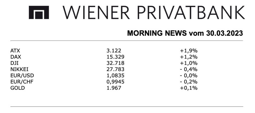 Aus den Morning News der Wiener Privatbank: "Der Wiener Aktienmarkt hat den Handel am Mittwoch mit deutlichen Aufschlägen beendet, bereits in den vergangenen zwei Tagen hatte die Börse in Wien zugelegt. Nach den jüngsten Turbulenzen rund um die Bankenkrise scheint nun wieder Zuversicht zu herrschen, der ATX konnte gestern einen Anstieg von 1,9% erzielen. Die Turbulenzen im Bankensektor werden aus Sicht von EZB-Chefvolkswirt Philip Lane wahrscheinlich nur ein vorübergehendes Phänomen sein. Auch andere Experten sprachen gestern davon, dass sich in Sachen Bankenkrise eine Beruhigung abzeichnet, zwar sei das Misstrauen der Marktteilnehmer noch erhöht und die Grundstimmung von Nervosität geprägt, je länger es aber keine negativen Schlagzeilen gäbe, desto stärker würde die Risikobereitschaft wieder zunehmen. Dementsprechend legten in Wien die schwergewichteten Bank-Aktien deutlich zu, die Bawag konnte ein Plus von 4,3% erzielen, für die Erste Group ging es um 4,6% nach oben. Einen Anstieg von 2,8% gab es auch für die Raiffeisen Bank International, hier verlangte der Interessenverband der Anleger vom Management klare Aussagen zum Russlandgeschäft, da der Streit der Landesbanken um die Zukunft dieses Segments den Streubesitz verunsichere und eine Kurserholung gefährden würde.