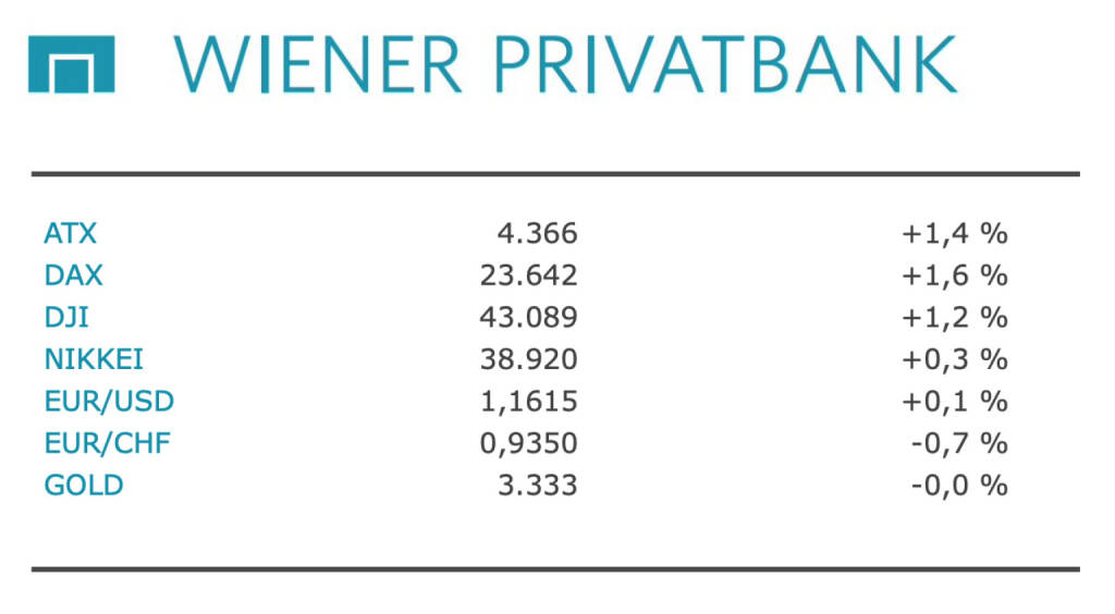 Aus den Morning News der Wiener Privatbank: Der Wiener Aktienmarkt hat gestern Dienstag den Handel mit klaren Kursgewinnen beendet. Der Leitindex ATX stieg um 1,37 Prozent auf 4.365,51 Punkte. Der ATX Prime schloss 1,38 Prozent höher bei 2.189,42 Zählern. Auch das europäische Umfeld zeigte sich einheitlich stark. Zudem tendierten die US-Aktienmärkte freundlich. Die Waffenruhe zwischen dem Iran und Israel steht weiterhin im Fokus. Zwar gab es von den Kriegsparteien gegenseitige Vorwürfe, dass die Waffenruhe verletzt worden sei. Laut dem US-Präsidenten Donald Trump ist sie aber weiter in Kraft. Ein Einbruch der Ölpreise auf das Vorkriegsniveau wurde von einem Marktbeobachter als Ausdruck großer Erleichterung bei den Anlegern gewertet. Ölaktien zählten allerdings angesichts der deutlichen Ölpreisrückgänge europaweit zu den größeren Verlierern.