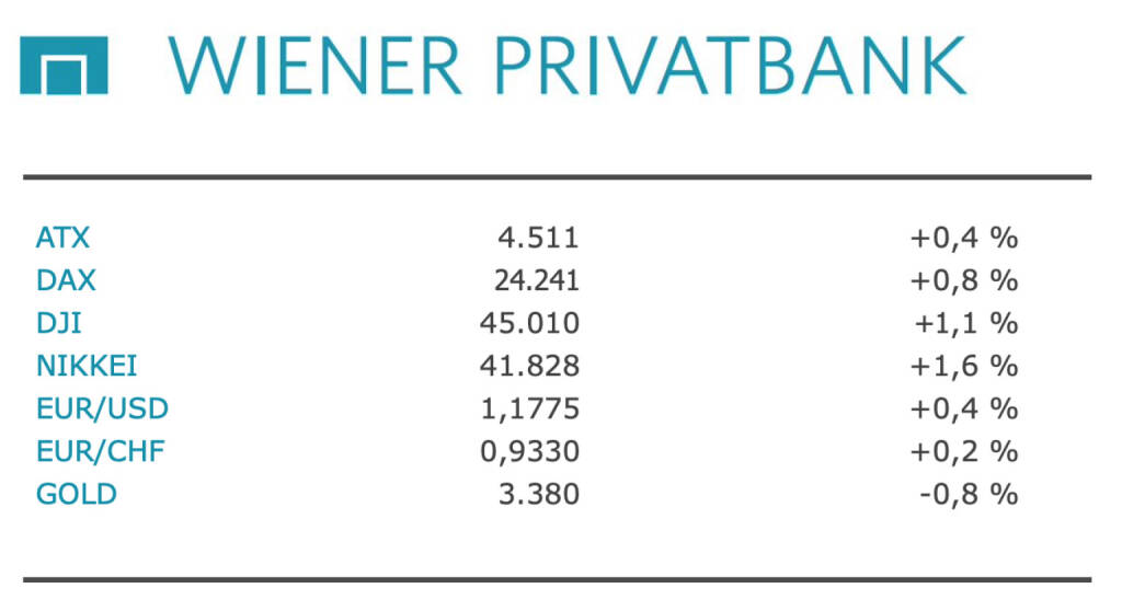 Aus den Morning News der Wiener Privatbank: "Die Wiener Börse hat gestern Mittwoch fester geschlossen. Der ATX stieg um 0,42 Prozent auf 4.510,94 Punkte. Der ATX Prime legte um 0,47 Prozent auf 2.266,77 Zähler zu. Auch an anderen Börsen in Europa ging es nach oben. Die von US-Präsident Donald Trump angekündigte Zolleinigung mit Japan schürte die Hoffnung auf ein ähnliches Abkommen mit der EU. Für Impulse sorgte am Mittwoch die anlaufende Ergebnisberichtssaison. Unter Druck kamen nach Meldung von Zahlen die Aktien von Bawag und Telekom Austria. Diese verloren 3,0 beziehungsweise 3,6 Prozent. Die Zahlen der Telekom lagen weitgehend im Rahmen der Prognosen. Das operative Ergebnis hat die Erwartungen erfüllt, die Umsätze lagen leicht über, das Nettoergebnis leicht unter den Konsensus-Schätzungen. Für Analysten bleibt die Hauptfrage, ob der Konzern seine Dividende für dieses Jahr wieder erhöhen kann.