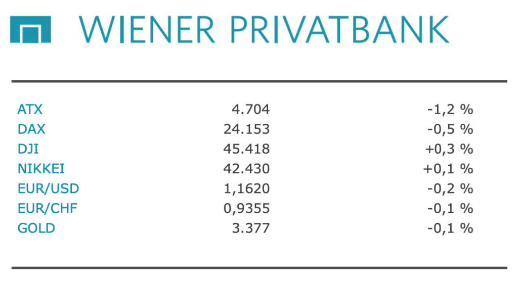 Aus den Morning News der Wiener Privatbank: "An der Wiener Börse sind die Aktienkurse gestern Dienstag gefallen. Der österreichische Leitindex ATX beendete den Handel bei 4.703,65 Punkten und damit 1,18 Prozent unter dem Vortagesschluss. Der mehr Aktien umfassende ATX Prime büßte 1,21 Prozent auf 2.350,16 Zähler ein. International standen an den Finanzmärkten die fortschreitenden Angriffe von US-Präsident Donald Trump auf die US-Notenbank Fed im Mittelpunkt. Dazu kamen erneute Zolldrohungen des Republikaners gegenüber China und Europa. Trump gab die sofortige Entlassung der Fed-Gouverneurin Lisa Cook bekannt. Der Präsident schrieb in seinem Brief an Cook, dass es hinreichende Gründe zu der Annahme gebe, dass sie in einem oder mehreren Hypothekenverträgen falsche Angaben gemacht habe. Cook stellte dies in Abrede und kündigte an, ihren Posten nicht kampflos zu verlassen. Aus den USA kamen auch datenseitig Impulse. Die Stimmung der Verbraucher in den USA hat sich im August wie von Ökonomen erwartet wieder eingetrübt. Der Auftragseingang langlebiger Güter in USA ging im Juli ebenfalls zurück - hier allerdings weniger deutlich als gedacht.