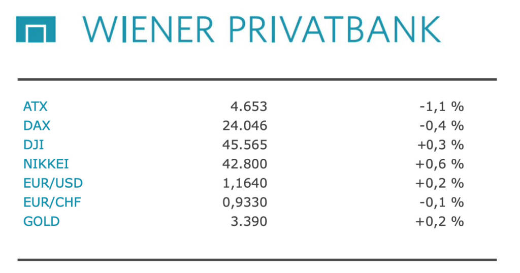 Aus den Morning News der Wiener Privatbank: "Der Wiener Aktienmarkt ist gestern Mittwoch mit Verlusten aus dem Handel gegangen. Der österreichische Leitindex ATX schloss 1,1 Prozent tiefer mit 4.652,9 Punkten. Lediglich drei ATX-Werte fuhren Kursgewinne ein. Der breiter gefasste ATX Prime sank um ein Prozent auf 2.326,9 Zähler. Im Fokus stand weiterhin der Konflikt zwischen US-Präsident Donald Trump und der US-amerikanischen Notenbank Fed, der diese Woche um eine Facette reicher geworden ist. Trump gab die sofortige Entlassung der Fed-Gouverneurin Lisa Cook bekannt. Der Präsident schrieb an Cook, es gebe hinreichende Gründe zu der Annahme, dass sie in einem oder mehreren Hypothekenverträgen falsche Angaben gemacht habe. Der Fall beschäftigt womöglich schon bald die US-Justiz. Die Klage von Cook gegen Präsident Trump könne bereits im Laufe des Tages eingereicht werden, berichtete der Sender CNBC. Nach US-Börsenschluss standen gestern die Aktien von Nvidia im Fokus. Anleger achten vor allem auf Signale, ob der KI-Boom anhält und die Rivalität zwischen den USA und China das Wachstum womöglich begrenzt.