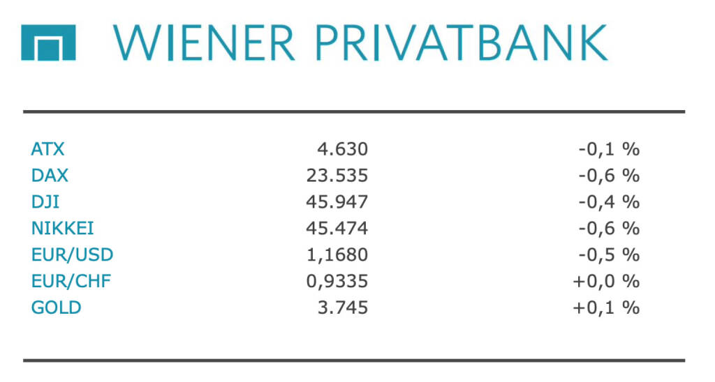Aus den Morning News der Wiener Privatbank: "Der Wiener Aktienmarkt hat sich gestern Donnerstag mit leichten Verlusten aus dem Handel verabschiedet. Der Leitindex ATX verlor 0,10 Prozent auf 4.630,31 Punkte. Auch die europäischen Leitbörsen verbuchten Rückgänge. An der Wall Street ging es im Verlauf ebenfalls abwärts. Marktbeobachter verwiesen auf zurückhaltende Anleger. Die am Nachmittag veröffentlichten US-Konjunkturnachrichten fielen besser aus als erwartet und ließen die Zinssenkungsspekulationen in den USA etwas zurückgehen. Investoren zeigten sich zudem vorsichtig vor den PCE-Inflationsdaten, die heute Freitag veröffentlicht werden und als wichtigstes Inflationsmaß der US-Notenbank Fed gelten.