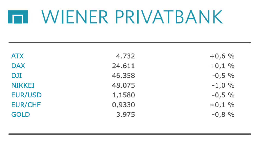 Aus den Morning News der Wiener Privatbank: "Der Wiener Aktienmarkt hat sich gestern Donnerstag höher aus dem Handel verabschiedet. Der Leitindex ATX schloss mit plus 0,62 Prozent auf 4.731,83 Punkte. Seit dem Jahresauftakt liegt er damit bereits fast 30 Prozent im Plus. An den europäischen Leitbörsen ging es am Berichtstag mit den Aktienkursen mehrheitlich leicht nach unten. Im Späthandel bremste eine verhaltene Stimmung an der Wall Street auch in Europa etwas die Kurse. Im Frühhandel wurden an den US-Börsen noch neue Rekordstände markiert. Am österreichischen Aktienmarkt rückten auf Unternehmensebene Agrana mit einer Zahlenvorlage und die OMV mit einem Quartalszwischenbericht in den Fokus. Der teilstaatliche Energie-und Chemiekonzern OMV hat im dritten Quartal 2025 seine Öl- und Gasproduktion weitgehend stabil gehalten, während sich die Raffineriemargen deutlich verbessert haben. Basierend auf dem Zwischenbericht erwarten Analysten nun die operativen Ergebnisse im dritten Quartal auf ähnlicher Basis wie im Vorquartal. Die OMV-Titel legten 0,5 Prozent zu.