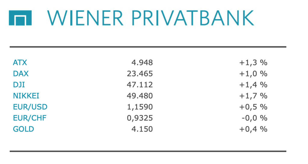 Aus den Morning News der Wiener Privatbank: "Nach einem schwächeren Beginn hat die Wiener Börse gestern Dienstag im Laufe des Tages satt ins Plus gedreht. Der Leitindex ATX legte am Dienstag um 1,25 Prozent auf 4.948,14 Punkte zu. Der breiter gefasste ATX Prime gewann 1,13 Prozent auf 2.459,32 Zähler. Die europäischen Börsen zeigten sich ebenfalls sehr freundlich. In den Fokus der Anleger rückten Konjunkturdaten aus den USA. Die Umsätze im US-Einzelhandel sind im September weniger stark gestiegen als erwartet. Sie legten im Vergleich zum Vormonat um 0,2 Prozent zu, Volkswirte hatten im Schnitt mit einem Plus von 0,4 Prozent gerechnet - nach einem Anstieg um 0,6 Prozent im August. Die Daten wurden mit großer Verzögerung veröffentlicht. Grund war die teilweise Schließung von Regierungsbehörden. In den USA ist zudem der Preisauftrieb auf Erzeugerebene im September gleich geblieben. Die Warenpreise legten im Jahresvergleich um 2,7 Prozent zu. Volkswirte hatten im Schnitt mit 2,6 Prozent gerechnet. Außerdem berichtete ein Sekretär des nationalen Sicherheitsrats der Ukraine, dass sich die Ukraine und die USA über einen Friedensplan geeinigt haben. Demnach soll der ukrainische Staatschef Wolodymyr Selenskyj noch im November zu einem Treffen mit US-Präsident Donald Trump reisen.