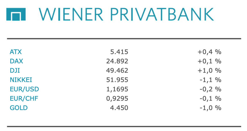 Aus den Morning News der Wiener Privatbank: "Der ATX hat sich gestern Dienstag auch nach bereits elf Gewinntagen noch in Rekordlaune gezeigt. Mit dem zwölften Plus in Folge stellte der österreichische Leitindex nun die bisher längste Gewinnserie aus dem Frühjahr 1991 ein, dem Anfangsjahr der Indexberechnung. Zum Handelsende notierte der ATX um 0,38 Prozent höher bei 5.415,39 Punkten. Der ATX Prime stieg um 0,33 Prozent auf 2.688,59 Zähler, während im europäischen Umfeld ebenfalls neue Rekordstände aufgestellt wurden. Marktbeobachter begründen die gute Entwicklung um den Jahreswechsel mit neuen Wetten auf eine Belebung der deutschen Konjunktur. Dies hatte zwar schon vergangenes Jahr maßgeblich zur guten ATX-Performance beigetragen, bei vielen heimischen Werten sehen Analysten aber durchaus noch weiteren Spielraum. Am Berichtstag standen moderat ausgefallene Inflationsdaten aus Deutschland und Frankreich im Fokus, die den Aktienkursen ebenso wie enttäuschende Stimmungsdaten aus dem Dienstleistungssektor jedoch nur geringe Impulse gaben. Daneben blieben auch die Entwicklungen rund um den US-Angriff auf Venezuela im Blick, wenngleich diese bereits am Vortag kaum belastend gewirkt hatten.