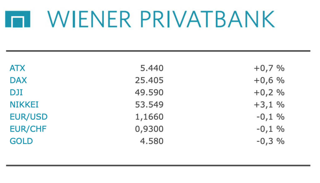 Aus den Morning News der Wiener Privatbank: "An der Wiener Börse hat sich die Rekordjagd gestern Montag fortgesetzt. Der österreichische Leitindex ATX verzeichnete einen Aufschlag von 0,69 Prozent auf 5.440,34 Punkte. Der ATX Prime schloss mit plus 0,61 Prozent bei 2.701,37 Zählern. Auch an den wichtigsten europäischen Börsen gab es überwiegend Gewinne zu sehen. Nachdem die Jahresendrally vergangene Woche abgeklungen war, ließ es der ATX in den vergangenen Tagen etwas gemächlicher angehen. Neuen Schwung könnte nun die anlaufende Berichtssaison bringen, die am heutigen Dienstag mit Zahlen aus dem US-Bankensektor startet. Zudem stehen Inflationsdaten aus den USA auf dem Programm, die mit Blick auf die Zinssitzung der US-Notenbank Fed Ende Januar von Bedeutung sind. Abseits der klassischen Geldpolitik bleibt der Konflikt zwischen US-Präsident Donald Trump und Fed-Chef Jerome Powell ein internationaler Unsicherheitsfaktor. Powell wies zuletzt strafrechtliche Ermittlungen gegen ihn und eine mögliche Anklage als Versuch politischer Einflussnahme auf die Unabhängigkeit der Notenbank zurück. Als Folge gerieten der US-Dollar und längerfristige US-Anleihen etwas unter Druck, während die Edelmetallpreise zulegten. Insgesamt blieben die Kursreaktionen an den Finanzmärkten aber überschaubar.