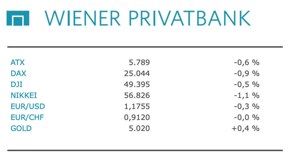Aus den Morning News der Wiener Privatbank: "Die Wiener Börse hat gestern Donnerstag im Minus geschlossen. Der österreichische Leitindex ATX fiel um 0,55 Prozent auf 5.788,53 Punkte. Der breiter gefasste ATX Prime verlor 0,53 Prozent auf 2.877,32 Zähler. Im europäischen Umfeld gab es nach durchwachsenen Quartalszahlen überwiegend Kursverluste. Der Späthandel wurde dann von einer schwachen Eröffnung an der Wall Street dominiert, die von zunehmenden Sorgen eines Angriffs der USA auf den Iran herrührten. Nach den jüngsten Atomverhandlungen zwischen den USA und dem Iran häufen sich Hinweise auf einen möglicherweise bald bevorstehenden Krieg. Der US-Sender CBS News zitierte informierte Quellen, wonach ranghohe nationale Sicherheitsbeamte dem US-Präsidenten Donald Trump mitgeteilt hätten, dass das Militär bereit sei, bereits am Samstag Angriffe auf den Iran durchzuführen. Trump habe aber noch keine endgültige Entscheidung getroffen.