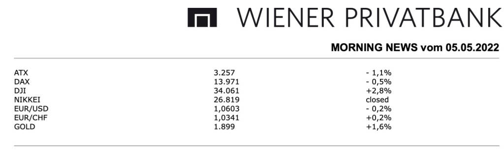 Aus den Morning News der Wiener Privatbank: Für die heimische Börse ging es gestern nach unten, der ATX musste mit einem Minus von 1,1% aus dem Handel gehen. Auch in Wien herrschte vor der anstehenden Sitzung der Fed Zurückhaltung, die gestern veröffentlichten Konjunkturdaten fielen auch allesamt enttäuschend aus. Gestern standen in Wien Unternehmensergebnisse im Mittelpunkt, mit der Raiffeisen Bank International, Lenzing und FACC berichteten gleich drei Unternehmen. Die RBI musste im gestrigen Handel 4,0% nachgeben, zwar war die Bank mit einem klaren Gewinnanstieg in das neue Jahr gestartet, der Nettogewinn lag bis März mit 442 Millionen Euro höher als im vierten Quartal 2021 mit 317 Millionen Euro und doppelt so hoch wie Anfang 2021 mit damals 216 Millionen Euro, allerdings wurde der Ausblick nach unten revidiert, vor allem auf Grund der höheren Risikokosten in Osteuropa. Der Textilkonzern Lenzing hat im 1. Quartal 2022 den Umsatz von 489,3 auf 615 Millionen Euro hochgeschraubt, das Periodenergebnis legte von 29,9 auf 34,1 Millionen Euro zu, das Unternehmen sprach von einer soliden Umsatz- und Ergebnisentwicklung bei einer extrem angespannten Kostensituation, von Analysten wurde dieses Ergebnis als im Rahmen der Erwartungen bezeichnet, die Aktie musste dennoch 2,1% nachgeben. FACC schloss ohne prozentuelle Veränderung, der Flugzeugteilebauer hat im ersten Quartal 2022 von einer Erholung der Luftfahrtbranche profitiert, der Umsatz kletterte auf 127,5 Millionen Euro, das entspricht einem Plus von 7,9 Prozent gegenüber dem Vorjahresquartal. Es gab auch Analystenstimmen, die Erste Group erhöhte das Kursziel für Strabag von 43,6 Euro auf 46,2 Euro und bestätigte die Kaufempfehlung, der Baukonzern konnte um 0,3% vorrücken. Die Berenberg Bank erhöhte das Kursziel für OMV von 52,0 Euro auf 57,0 Euro und bestätigte die Kaufempfehlung, der Ölkonzern konnte sich leicht um 0,3% verbessern. Schwächster Wert des gestrigen Tages war AT & S, für den Leiterplattenproduzenten ging es um 4,5% nach unten, Gewinner des Tages war Agrana, für den Zuckerhersteller gab es eine Verbesserung von 2,7%.