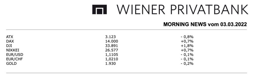 Aus den Morning News der Wiener Privatbank: Keine Verbesserung gab es gestern für den heimischen Markt, allerdings konnte der ATX klar über dem Tagestief schliessen und dadurch eine Stabilisierung nach der Talfahrt der letzten Tage erzielen, das österreichische Börsenbarometer beendete den Handel mit einem Minus von 0,8%. Erneut tiefer schlossen die im Index schwergewichteten Banken, die Erste Group verbilligte sich um weitere 4,2%, für die Raiffeisen Bank International gab es ein Minus von 2,7%. Besser lief es da für die Bawag, die lediglich 0,3% tiefer schloss, die Addiko Bank musste um 1,7% nachgeben. Nach der Zahlenvorlage fiel der Flughafen Wien um 2,5%, er konnte aber im vergangenen Jahr wieder in die schwarzen Zahlen zurückkehren, unterm Strich erzielte das Unternehmen einen Gewinn von 6,1 Millionen Euro nach einem Verlust von 57,7 Millionen Euro im Jahr 2020. Allerdings erhöht der Krieg in der Ukraine nach Aussagen der Unternehmensführung die Unsicherheit über die künftige Entwicklung, was gestern zum Rückgang führte. Die Erste Group hat das Kursziel für Schoeller-Bleckmann von 42,5 Euro auf 44,8 Euro erhöht und die Einstufung als „Accumulate“ bestätigt, für den Ölfeldausrüster ging es gestern um 5,7% nach oben.
