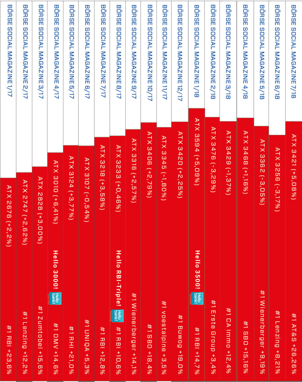 Willkommen im August und den Schweizer Lesern einen schönen Nationalfeiertag. ATX und ATXPrime haben es gestern pünktlich zum Juli-Ultimo zurück über ihre MA200 geschafft (nach jeweils 63 Tagen). Das brachte dem ATX auch ein Comeback beim Jahresstartwert. Das Monatsplus im Leitindex betrug +5,08 Prozent. Die beste Aktie im Juli war AT&S mit +26,26 Prozent. Der gestrige Anstieg von 13,82 Prozent war der beste Tag eines ATX-Unternehmens 2018, die FACC-Performance vom 17.7. (damals 12,74 Prozent) wurde getoppt. Mit dem Ultimo ist auch der Heftrücken des neuen Börse Social Magazine fertig, siehe hier: https://photaq.com/page/pic/73419/ .