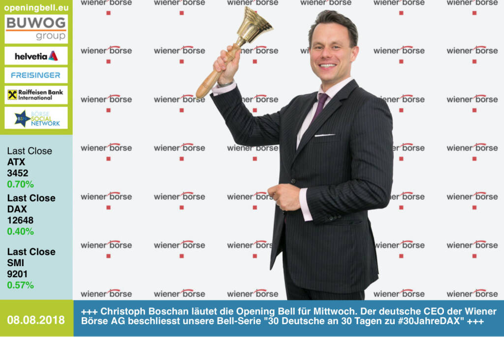8.8.: Christoph Boschan läutet die Opening Bell für Mittwoch. Der deutsche CEO der Wiener Börse AG beschliesst unsere Bell-Serie "30 Deutsche an 30 Tagen zu #30JahreDAX" http://www.wienerborse.at https://www.facebook.com/groups/GeldanlageNetwork #goboersewien