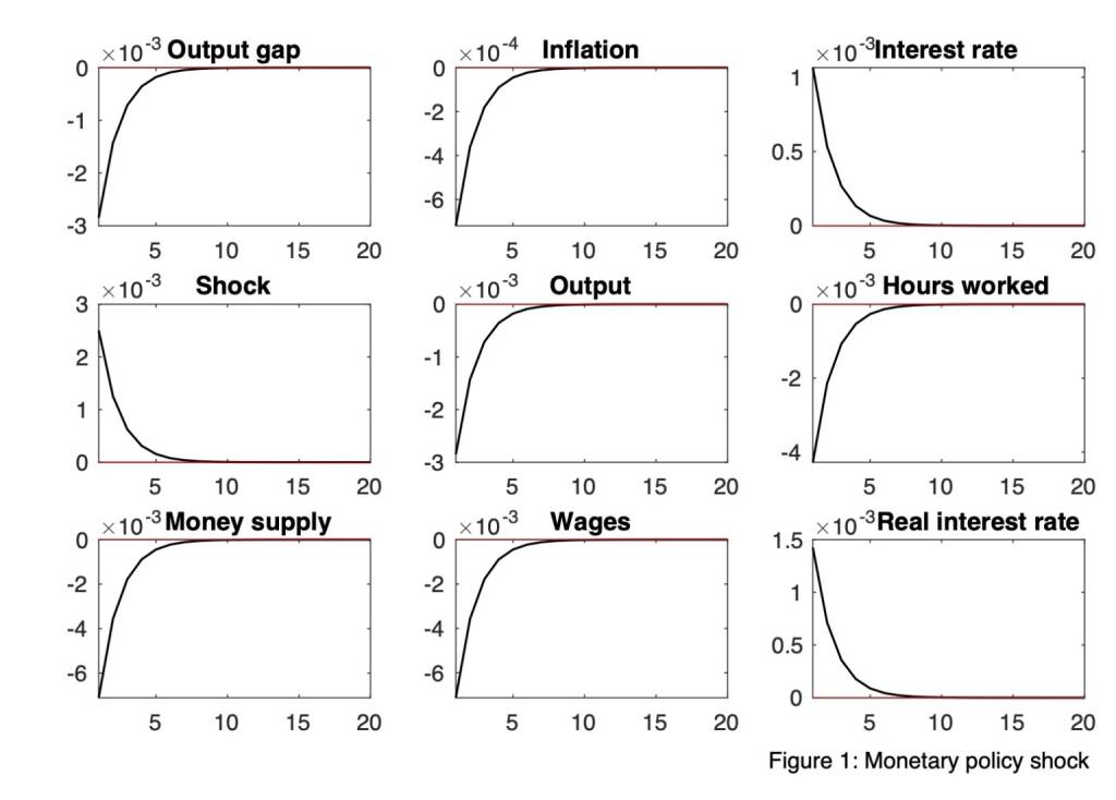 To illustrate the dynamics effects, figure 1 shows impulse response functions of a contractionary monetary policy shock (one a standard deviation rise in the nominal interest rate) hitting the economy. The real interest rate increases, the inflation rate, output and hours worked decrease. The output gap becomes negative. The central bank engineers a reduction in the money supply.