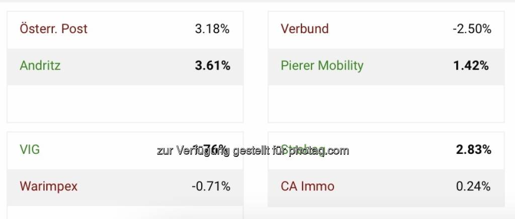 Um 10:20 liegt der ATX TR mit -0.12 Prozent im Minus bei 6107 Punkten (Ultimo 2021: 7849, -22.19% ytd). Topperformer der PIR-Group sind Porr mit +1.76% auf 12.13 Euro, dahinter Österreichische Post mit +1.64% auf 27.85 Euro und Zumtobel mit +1.52% auf 6.66 Euro. Zum Vergleich der DAX: 12848 ( -0.16%, Ultimo 2021: 15884, -19.11% ytd).