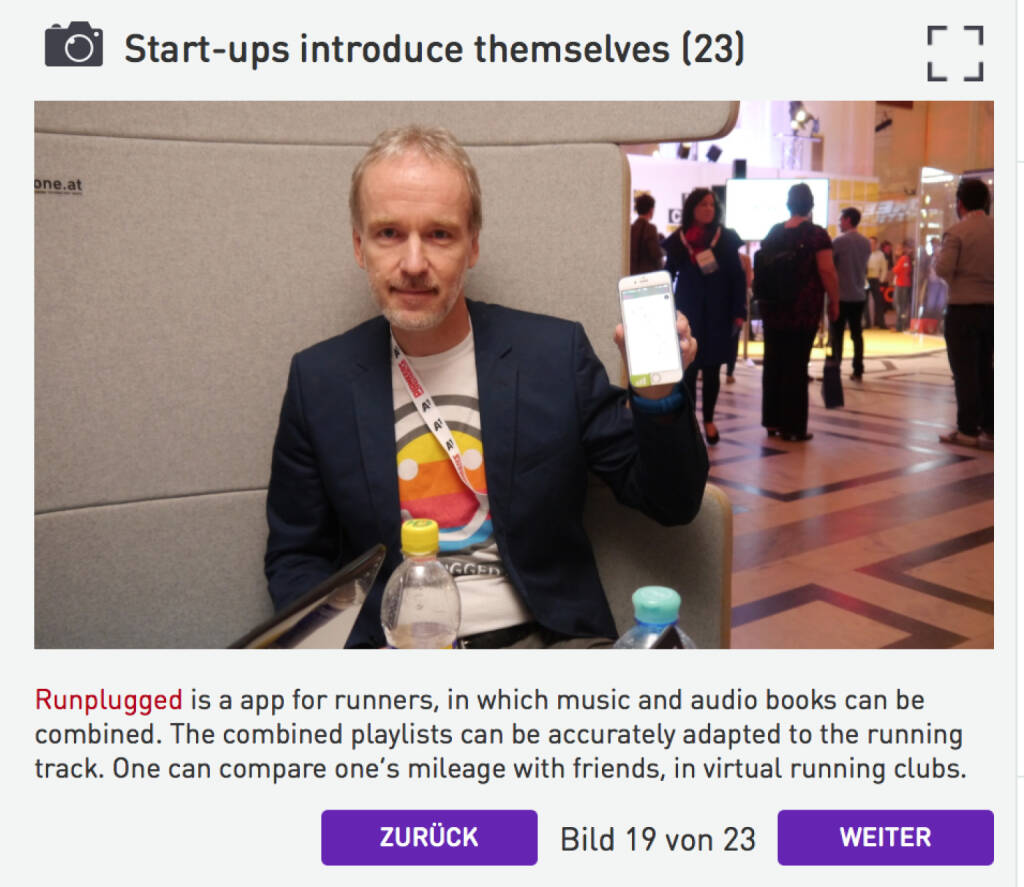 Auf dem Pioneers Festival (-> Pioneers Festival 2015, Handypics photaq ) gaben die Kollegen von Futurezone die Möglichkeit, sein Startup kurz für eine Diashow vorzustellen. Hab ich für http://www.runplugged.com auch gemacht. Und ich muss sagen: Lässige Leute, sympathisch, kompetent. Anbei das Ergebnis: http://futurezone.at/thema/start-ups/star-ups-introduce-themselves/133.337.623/slideshow , Runplugged ist dabei. In der deutschen Variante ist beim Screenshot ein Sager eines anderen Unternehmers stehengeblieben. Also: "Ich mag Start Ups und ich mag Sex" ist kein Zitat, das ich fallengelassen habe ...