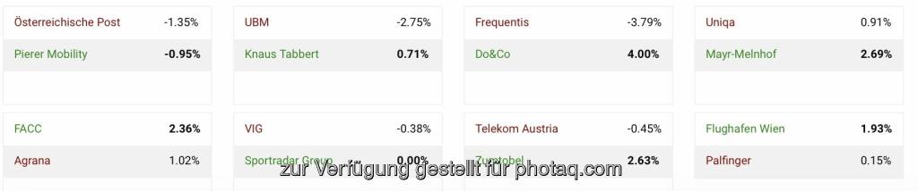 Um 11:41 liegt der ATX TR mit -0.18 Prozent im Minus bei 8099 Punkten (Ultimo 2021: 7849, 3.18% ytd). Topperformer der PIR-Group sind Rosenbauer mit +1.20% auf 46.55 Euro, dahinter UBM mit +1.07% auf 42.65 Euro und VIG mit +1.06% auf 26.325 Euro. Zum Vergleich der DAX: 16007 ( -0.03%, Ultimo 2021: 15884, 0.77% ytd).