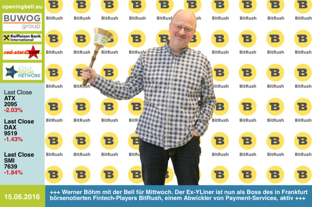 15.6: Werner Böhm mit der Opening Bell für Mittwoch. Der Ex-YLiner ist nun als Boss des in Frankfurt börsenotierten Fintech-Players BitRush, einem Abwickler von Payment-Services, aktiv http://boerse-social.com/2016/05/23/ex-yline_chef_werner_bohm_listet_bitrush_mit_hilfe_von_ex-borseboss_stefan_zapotocky_an_der_frankfurter_borse_angelika_kramer_fur_das_fintech-fachheft_44