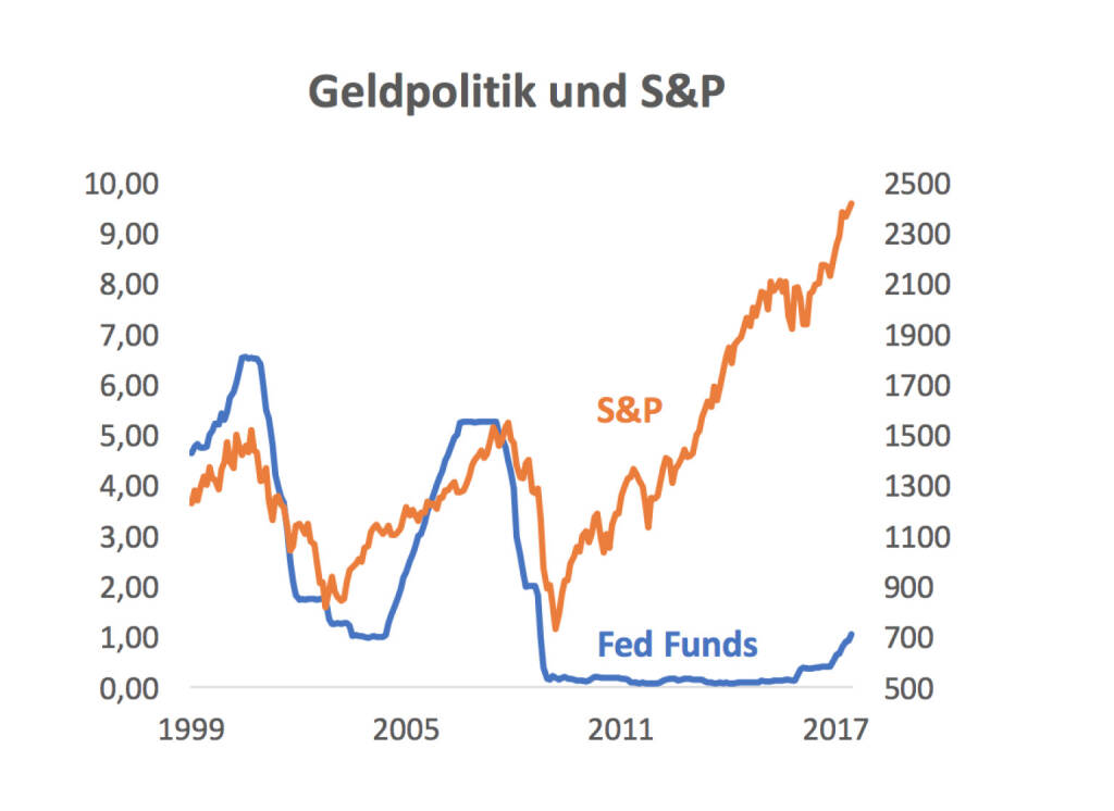 Mittwoch und Donnerstag durfte ich die Hello bank! Invest-Foren in Wien und Graz als Moderator begleiten. Sowohl im Reitersaal der OeKB als auch in der Seifenfabrik in Graz ist mir das hohe Interesse des Publikums aufgefallen, im nächsten Börse Social Magazine werden wir über die Events, bei denen kumuliert knapp 300 Gäste anwesend waren, berichten. Zwei Aspekte möchte ich vorziehen, sie beziehen sich auf den Input von Martin Hüfner, volkswirtschaftlicher Berater der Bank und einer jener, die ich via boersenradio.at am liebsten beim Laufen höre. Nur: Beim Laufen hat man Audio und bekommt ein Bigger Picture, aber auf der Bühne hat man zusätzlich Hüfner persönlich und seine liebevoll zusammengestellten Slides mit netten kleinen Charts. Ich bin seit den Achtzigern des alten Jahrhunderts an den Börsen tätig und in meiner Ausbildung lernte ich, dass steigende Zinsen Gift für den Aktienmarkt seien. Und es war quasi gesetzt, dass das so ist. Und es war damals auch richtig. Martin hat einen Slide seiner Präsentation mit "Zinsanstieg hilft den Aktienmärkten" getitelt. Da reissts einen zunächst natürlich. Wenn man sich aber den Parallel-Chart der US-Leitzinsen vs. S&P ansieht, dann sieht man, dass das einfach "The new normal" ist. Und zwar nicht erst seit kurzem, sondern immerhin seit 1999.