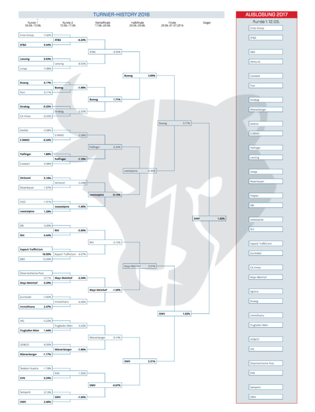 Ebenfalls ein ganz spezielles Duell: Agrana machte im Q1 eine grosse Kapitalerhöhung und ist - vor allem deswegen - einer der grossen Jahresverlierer 2017 bisher, zuletzt aber wieder deutlich stärker: In der Wochensicht liegt die Aktie um 6,75% im Plus, in der Monatssicht 8,98% im Plus, ytd 8,73% im Minus. Gegner ist der Finalist aus 2016: Buwog. In der Wochensicht liegt die Aktie um 0,42% im Plus, in der Monatssicht 6,57% im Plus, ytd 18,24% im Plus.