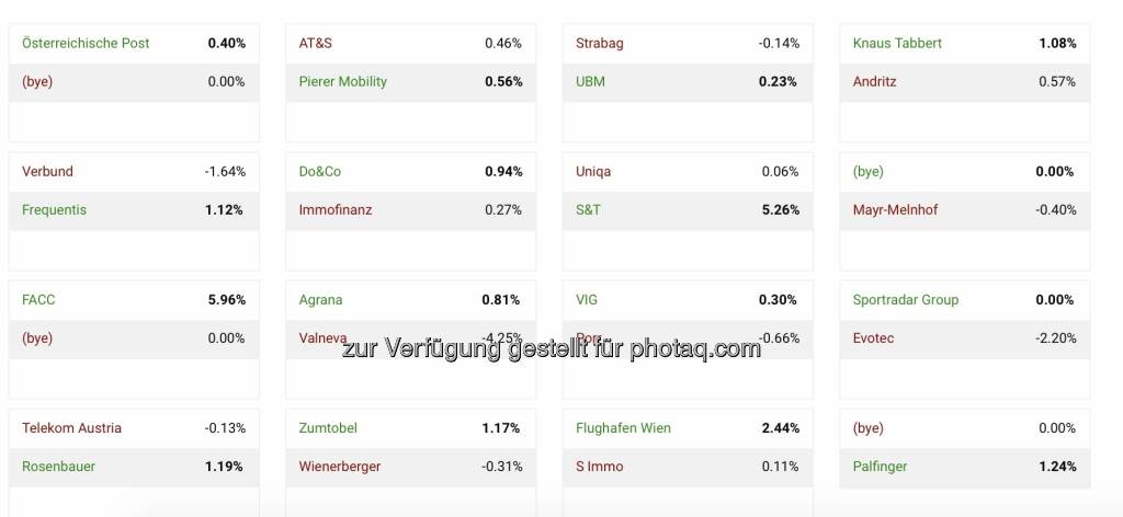 Um 11:38 liegt der ATX TR mit +0.10 Prozent im Plus bei 7856 Punkten (Ultimo 2020: 5466). Topperformer der PIR-Group sind FACC mit +6.38% auf 7.5 Euro, dahinter Polytec Group mit +4.00% auf 7.145 Euro und Flughafen Wien mit +2.73% auf 27.325 Euro. Zum Vergleich der DAX: 16025 (+0.81%, Ultimo 2020: 13719).