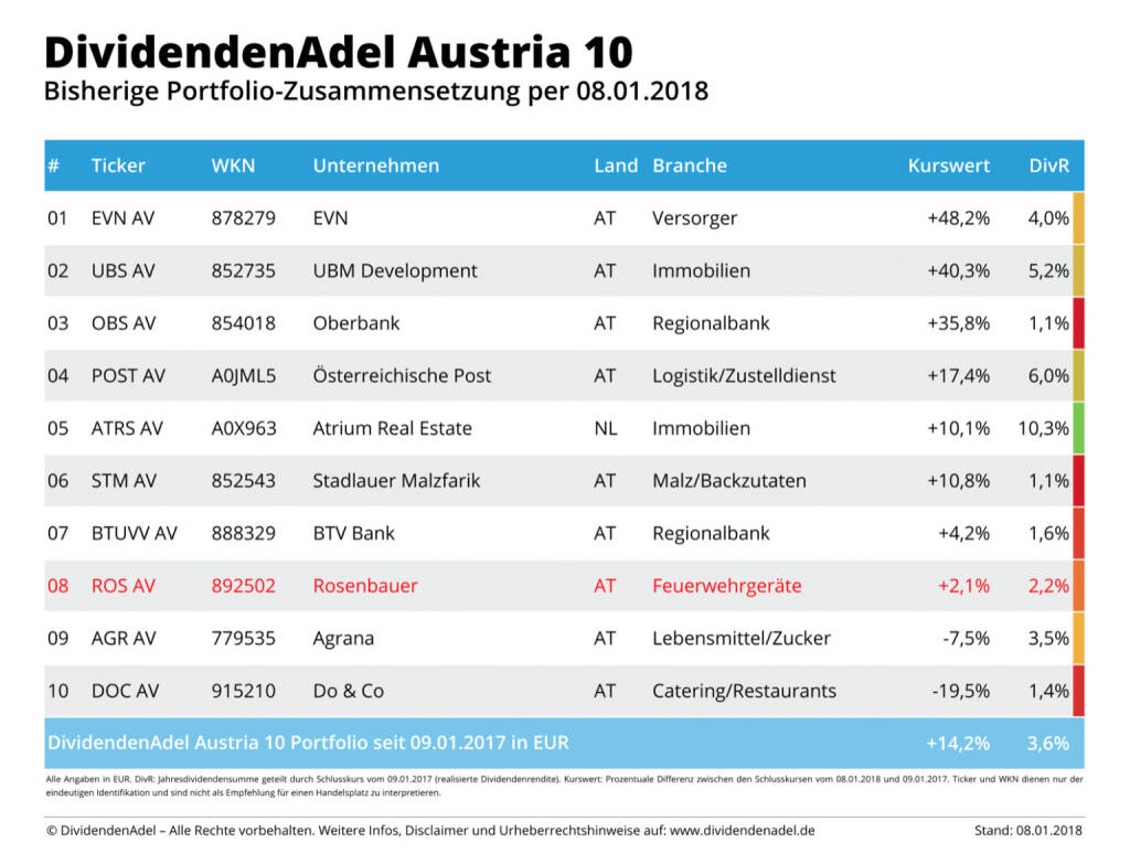 Umschichtung im DividendenAdel Austria 10 Portfolio von Christian W. Röhl. Nicht mehr im DividendenAdel Austria vertreten ist Rosenbauer. Der Feuerwehr-Ausrüster hat im Vorjahr seine Ausschüttung von 1,50 auf 1,20 Euro gesenkt und damit nach fünfzehn Jahren seine weiße Dividenden-Weste besudelt, so der deutsche Dividenden-Experte. Stattdessen wird Mayr Melnhof hinzugefügt.