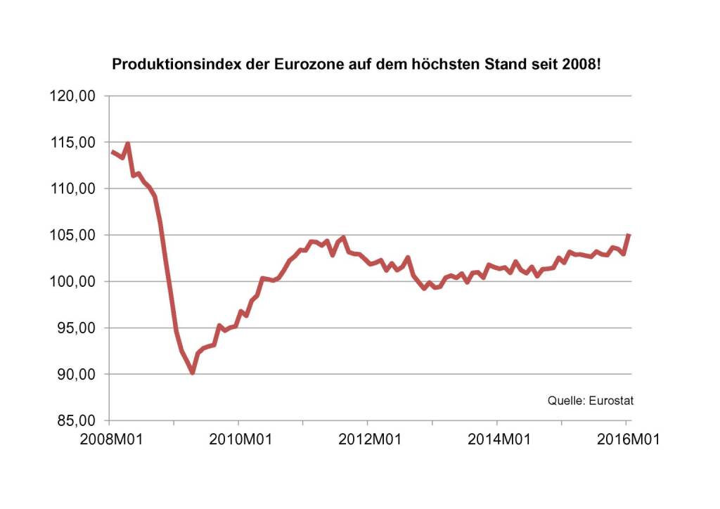 Was ist mit den harten Wirtschaftsdaten? Die Konjunkturerholung in der Eurozone setzt sich allen Skeptikern zum Trotz fort. Im Januar gab es mit +2,1 Prozent den stärksten Anstieg bei der Industrieproduktion seit September 2009! Der Produktionsindex befindet sich auf dem höchsten Stand seit Ende 2008. Auch in den USA bleibt die Wirtschaft robust, das dürften die zahlreichen Konjunkturdaten der nächsten Tage zeigen. Zu Freudentänzen gibt das zwar keinen Anlass, von einer drohenden Rezession ist aber auch nichts zu sehen.