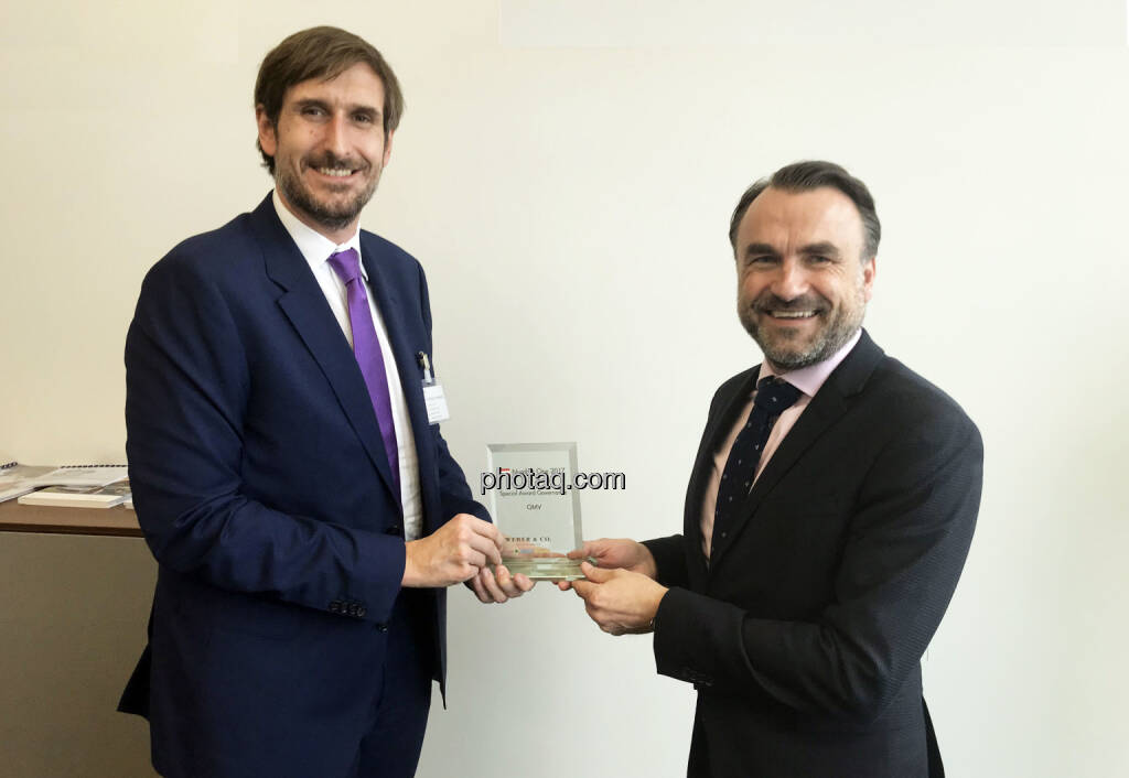 Einen ATXFive-Titel, besser gesagt dessen IR-Chef, haben wir gestern besucht. Hintergrund: Im Rahmen unserer Number One Awards https://boerse-social.com/numberone/2017 für 2017 wurde die Leistung der OMV in den Bereichen Kapitalmarkt-Kommunikation, Recht und Emissionen in den vergangenen Jahren (zB 1-Mrd.-Euro-Bond 2017) ausgezeichnet. Der Tombstone wurde gestern vom Award-Partner Christoph Moser (Weber & Co.) an den von der BASF kommenden IR-Chef der OMV, Florian Greger, im 19. Stock des OMV-Headquarters bei der Krieau übergeben.