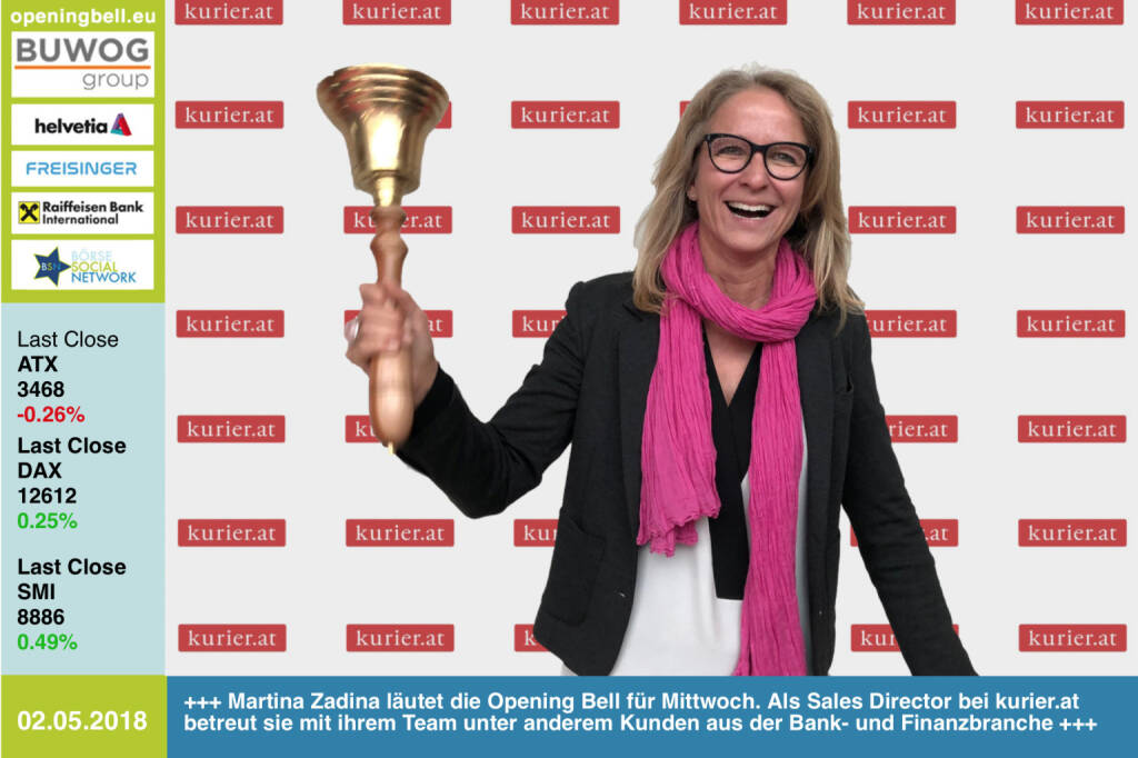 2.5.: Martina Zadina läutet die Opening Bell für Mittwoch. Als Sales Director bei kurier.at betreut sie mit ihrem Team unter anderem Kunden aus der Bank- und Finanzbranche http://www.kurier.at https://www.facebook.com/groups/GeldanlageNetwork/ #goboersewien