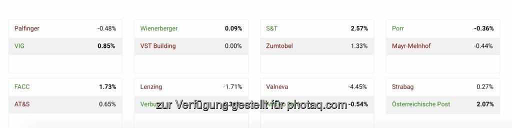 Um 11:17 liegt der ATX TR mit -0.11 Prozent im Minus bei 6876 Punkten (Ultimo 2020: 5466). Topperformer der PIR-Group sind Rosenbauer mit +1.94% auf 52.6 Euro, dahinter Andritz mit +1.03% auf 46.98 Euro und Warimpex mit +0.95% auf 1.3325 Euro. Zum Vergleich der DAX: 15784 ( -0.04%, Ultimo 2020: 13719).