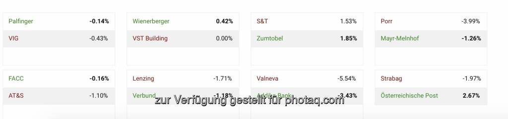 Um 10:54 liegt der ATX TR mit +0.27 Prozent im Plus bei 6855 Punkten (Ultimo 2020: 5466). Topperformer der PIR-Group sind Wienerberger mit +2.22% auf 33.65 Euro, dahinter Agrana mit +1.54% auf 18.48 Euro und S Immo mit +1.53% auf 19.9 Euro. Zum Vergleich der DAX: 15692 (+0.40%, Ultimo 2020: 13719).
