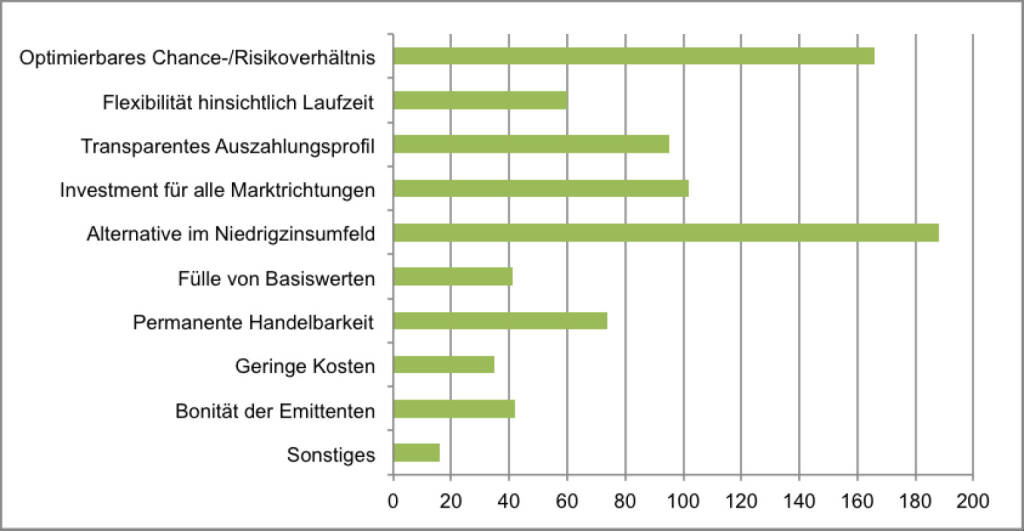Das Hauptargument, das die Berater einsetzen und das bei den Kunden wirkt, ist die Alternative zu herkömmlichen Anlagen im Niedrigzinsumfeld. An zweiter Stelle steht die Möglichkeit, das Chancen-Risiko-Verhältnis zu optimieren und selbst zu wählen. Dass Zertifikate ein Investment für jede Marktsituation sind und dass das Auszahlungsprofil transparent ist, wird – wenn auch mit deutlichem Abstand – als Unterstützung für die Kaufentscheidung genannt. Darüber hinaus scheint die permanente Handelbarkeit ein wichtiges Argument zu sein.
