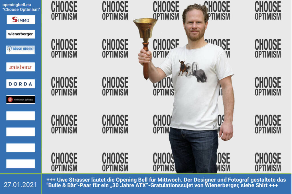 27.1.: Uwe Strasser läutet die Opening Bell für Mittwoch. Der Designer und Fotograf gestaltete das geniale "Bulle & Bär"-Paar für ein „30 Jahre ATX“-Gratulationssujet von Wienerberger, siehe Shirt http://www.herruwe.com