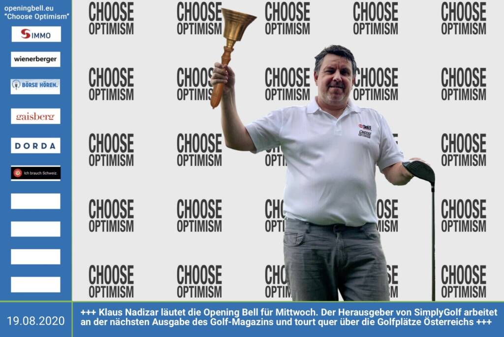 19.8.: Klaus Nadizar läutet die Opening Bell für Mittwoch, Long Distance Style (vorher/nachher unter https://photaq.com//page/index/3781). Der Herausgeber von SimplyGolf arbeitet an der nächsten Ausgabe des Golf-Magazins und tourt quer über die Golfplätze Österreichs https://simplygolf.at mehr Choose Optimism: https://boerse-social.com/category/choose_optimism https://www.facebook.com/chooseoptimism/