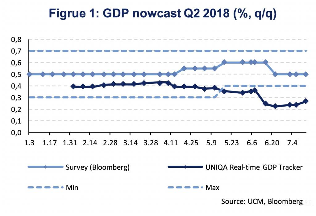 Euro Area economic growth slowed down during the first quarter of the year and business cycle indicators, like industrial production, retail sales or sentiment indicators, have, so far, signaled an extension of muted growth into the second quarter. Quarter-on-quarter (q/q) real GDP growth was 0.4 % (seasonally adjusted, sa) in Q1 2018 compared to average growth of 0.7 % (q/q, sa) in 2017. Industrial production was weak in April, even declining compared to March (-0.8 %, m/m, sa). Last week’s industrial production figures for May have been better (1.3 %, m/m, sa), mainly driven by Germany (2.5 %, m/m, sa). Our GDP tracker, which is based on a dynamic factor model for Nowcasting and combines a large set of high frequency indicators, is currently projecting Euro Area GDP growth at 0.3 % (q/q, sa) for the second quarter of 2018 with growth regaining strength recently (Figure 1).