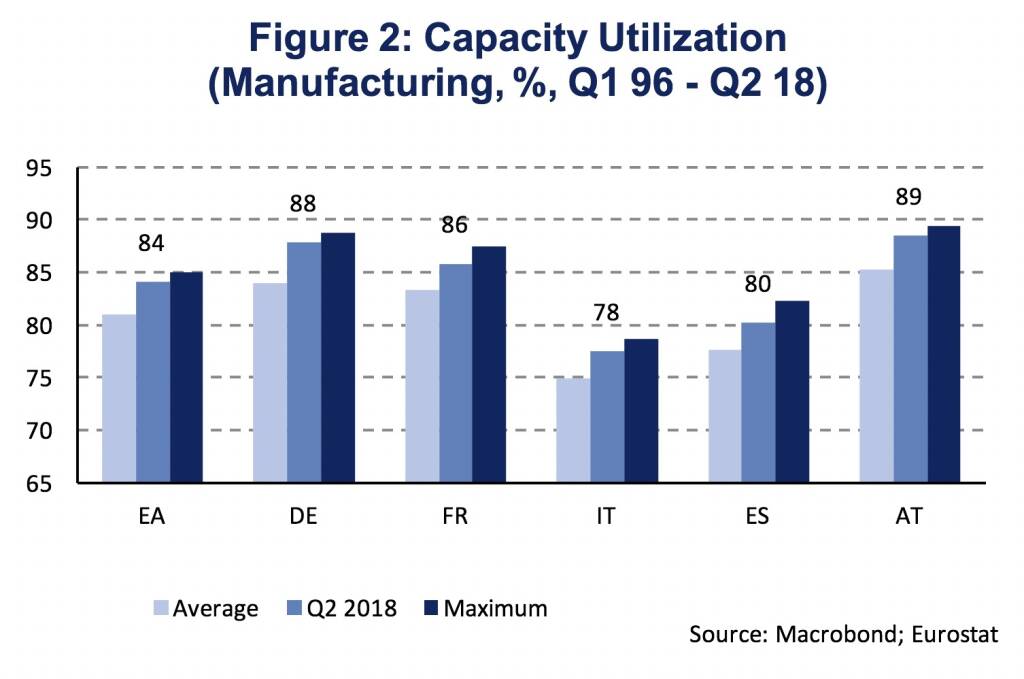 Capacity utilization in the Euro Area has reached 84.1 % in Q2 2018 which is well above its long-term average (81 %) and even close to the maximum degree of capacity utilization, which was reached in Q3 2017 (85 %). Among the four largest Euro Area economies, Germany has reached the highest degree of capacity utilization (88 %), after France (86 %), Spain (80 %) and Italy (78 %). In Austria, the manufacturing industry even produces at 89 % of its capacity (Figure 2).