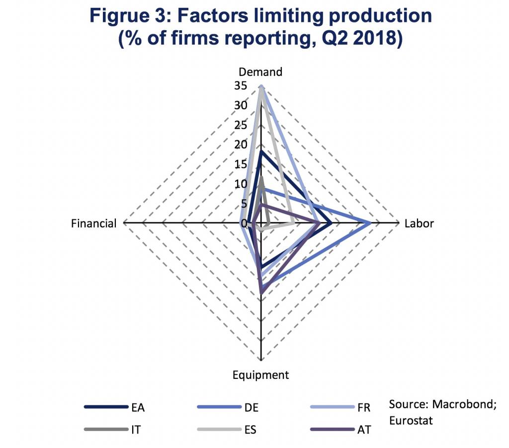 Looking at the factors, which firms report to limit production, we see a balanced picture in the Euro Area aggregate and distinct differences across individual member states (Figure 3). Insufficient demand is the most important factor limiting production in France and Spain, while labor and capital constraints are more restrictive in Germany and Austria. In the Euro Area aggregate, insufficient demand and labor constraints are the most significant limiting factors being reported by 18 % of firms. However, while insufficient demand is declining in importance, labor shortages are gaining significance.