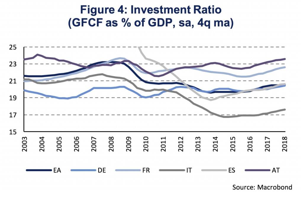 Investment has not yet, reached pre-crisis levels. Investment, measured as gross fixed capital formation (GFCF), has been growing steadily in the Euro Area since 2016, averaging 4.0 % (y/y, sa). In spite of the acceleration of growth, the level of investment is still 4.4 % below its pre-crisis peak in Q1 2008. The level of GDP, on the other hand, is already 6.4 % above. This indicates that the current expansion has, until now, been characterized by a slow recovery of investment activity. Figure 4 shows the respective investment ratios, which give the nominal value of gross fixed capital formation as a percentage of the nominal value of GDP, for the Euro Area, Germany, France, Italy, Spain and Austria. Investment ratios are highest in Austria (23.5 %) and France (22.7 %) with the Euro Area at 20.7 % in Q1 2018. However, only Germany and Austria have surpassed investment ratios seen in 2008. The Euro Area remains 2.3 %-age point below the 2008 ratio. Spain shows the largest gap (-8.5 %) to the pre-crisis peak, which was, however, driven by a real estate boom. In Italy the gap to 2008 is -3.7 %-age points, so less significant compared to Spain, however, the recovery in investment activity has been less rapid and the investment ratio is substantially lower (17.6 %).
