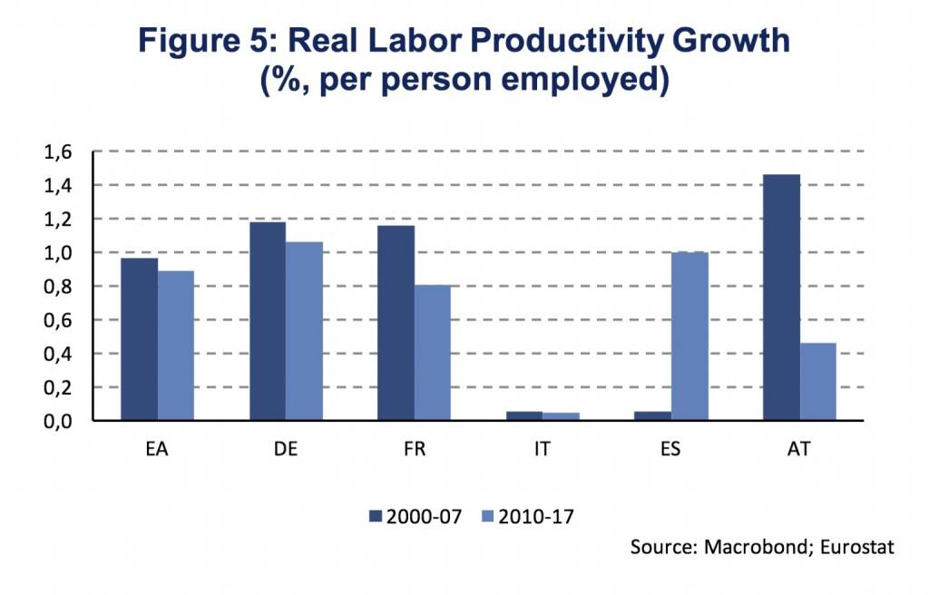 Differences in productivity growth between the pre-crisis (2000-07) and post-crisis (2010-17) period are less substantial as the slow recovery in investment activity would have suggested. Figure 5 shows the growth rate of real labor productivity, which is defined as real GDP over total employment, for the Euro Area, Germany, France, Spain, Italy and Austria. Labor productivity growth has been slower during the post-crisis period for all economies except for Spain. For the Euro Area aggregate, the difference in growth rates is rather small. Between the years 2000 and 2007 average annual growth of real labor productivity was 1.0 % compared to 0.9 % between 2010 and 2017. Differences are less pronounced as the growth of total employment was less substantial (2000-07: 1.3 %, 2010-17: 0.4 %). As employment growth was subdued in the post-crisis period, less investment activity was needed in order to achieve a similar growth rate in labor productivity. The employment effect is most pronounced in Spain, where employment growth was negative (-0.3 %) between 2010 and 2017 compared to average annual growth at 3.7 % between 2000 and 2007.