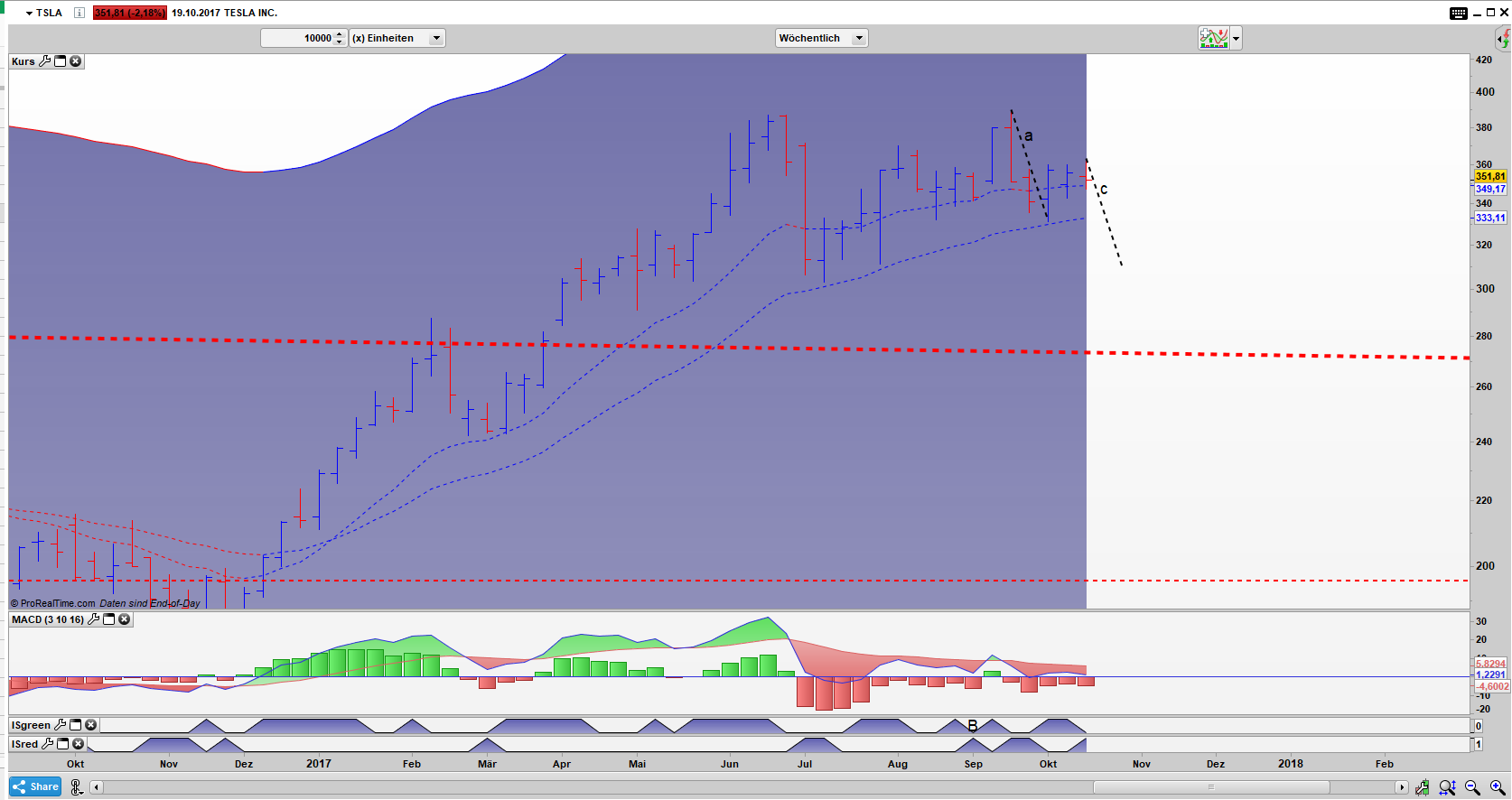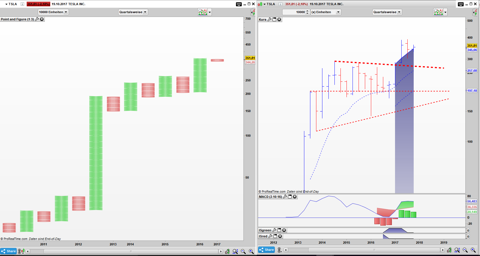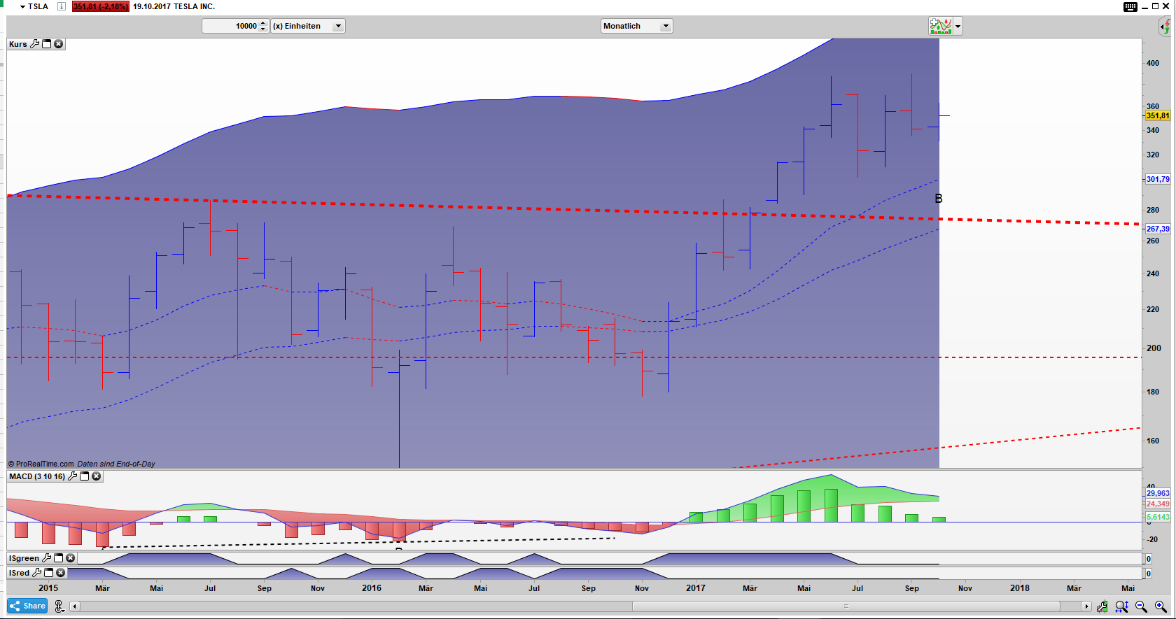 Solang sich die Aktie oberhalb des Dreiecks halten kann ist die Welt für die Bullen in Ordnung. Erst ein Eintauchen in dieses lässt das positive Szenario in sich zusammenbrechen. Deshalb gehe ich davon aus, dass sollte die Aktie den genannten Bereich um die $ 308,- erreichen, es sich um eine erneute Kaufchance handeln wird. Die Ziele aus dem Dreiecksausbruch haben weiterhin bestand und befinden sich zwischen $ 450,- bis 700,- je Aktie.
