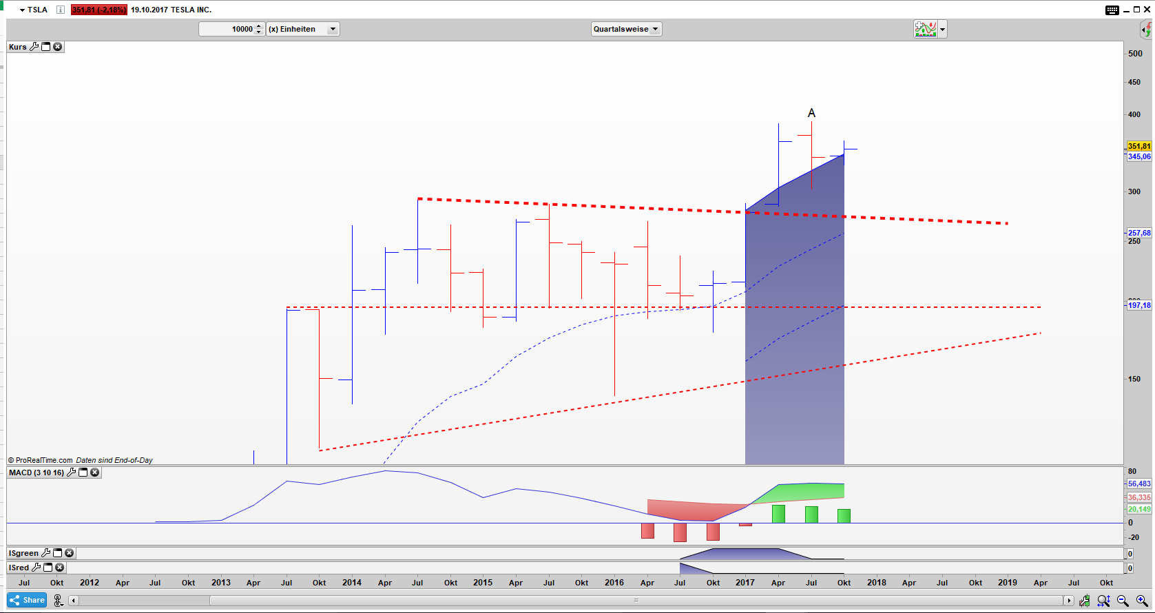 Die Elektrifizierung des Transportwesens ist im vollen Gange. Immer mehr Städte weltweit wollen die Verbrennungsmotoren aus ihrem Innersten verbannen und auch die Weiterentwicklung der Batterietechnologie treibt die Verbreitung der Electric Vehicles voran. Im Jahr 2015 lag der Anteil der EV´s an allen Light Duty Vehicles auf der Welt bei gerade einmal 0,2%, recht mickrig, wenn man das exponentielle Wachstum außer acht lässt. Der Markt wächst durchschnittlich um 60% im Jahr, was darauf schließen lässt, dass in weniger als 13 Jahren 100% der Fahrzeuge elektrisch angetrieben sein werden. Diese Annahme ist natürlich recht oberflächlich, was mir durchaus bewusst ist und diente nur dazu das Potential des exponentiellen Wachstums aufzuzeigen. So einige Unternehmungen haben die Richtung erkannt und bewegen sich stramm darauf zu, doch die Wertvollste Marke in dem Bereich ist weiterhin das von Elon Musk gegründete Unternehmen Tesla Inc.. Tesla (WKN: A1CX3T / ISIN: US88160R1014) ließ die Aktionäre seit der Erstnotiz traumhafte Gewinne einfahren, doch wie geht es jetzt mit der Kursparty weiter?