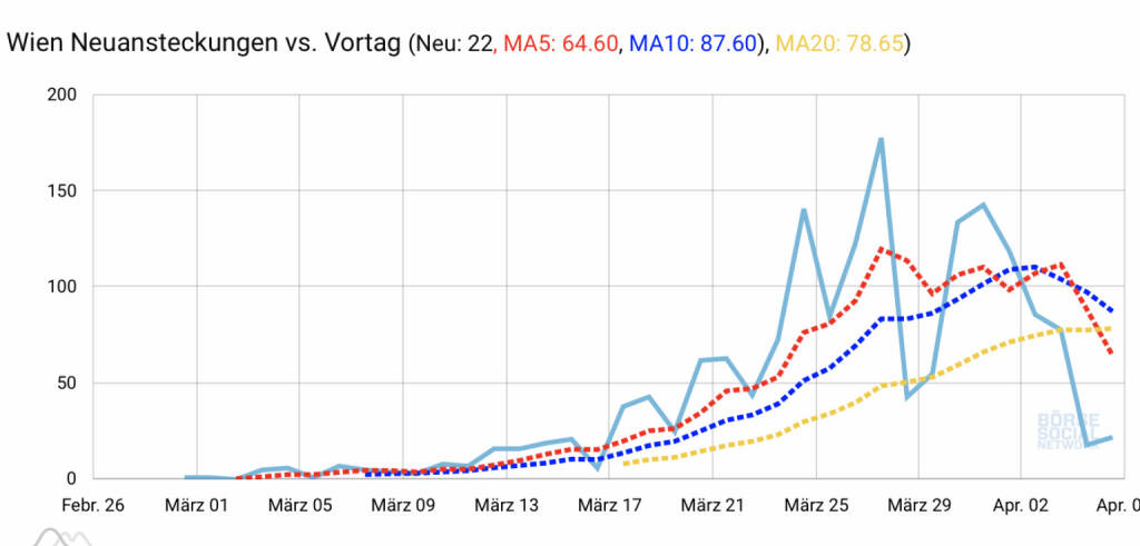 5.4. 15 Uhr:Covid-Neufinfektionen Wien zurück auf dem Niveau von Mitte März . Der MA5 (rot) und der MA10 (blau) ist bereits im Fallen, der MA20 (gelb) könnte dies bald tun. Also zummindex charttechnisch viele Zeichen für weitere Rückgänge