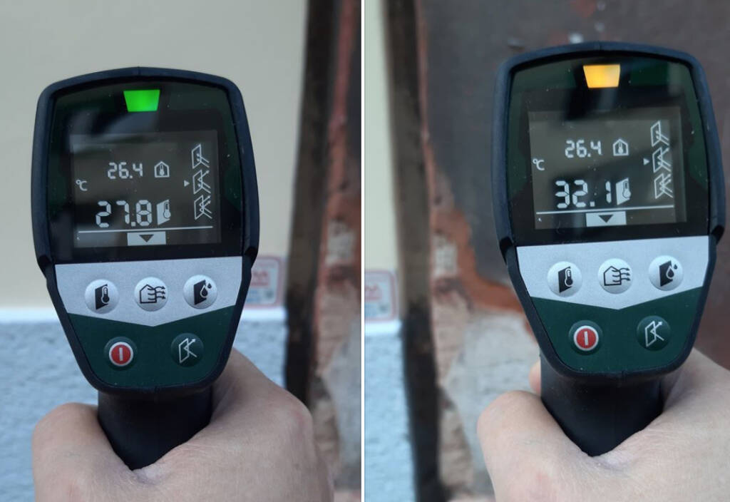 Fassaden: Erstaunlicherweise hatten praktisch alle Fassaden eine annähernd gleiche Temperatur wie die Luft, Überraschend ein Test in der Reznicekgasse: Fassentemperatur des rötlichen Gemeindebaus war um mehr als 4 °C höher als das Gründerzeithaus mit heller Fassade 1m daneben (siehe Foto). Einige weitere Tests bei dunklen Fassaden brachten kaum Unterschiede, vielleicht liegt´s daher am Baumaterial.