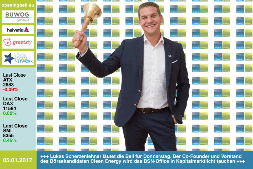 5.1.: Lukas Scherzenlehner läutet die Opening Bell für Donnerstag. Der Co-Founder und Vorstand des Börsekandidaten Cleen Energy wird das BSN-Office in Kapitalmarktlicht tauchen http://www.cleen-energy.com https://www.facebook.com/groups/GeldanlageNetwork/