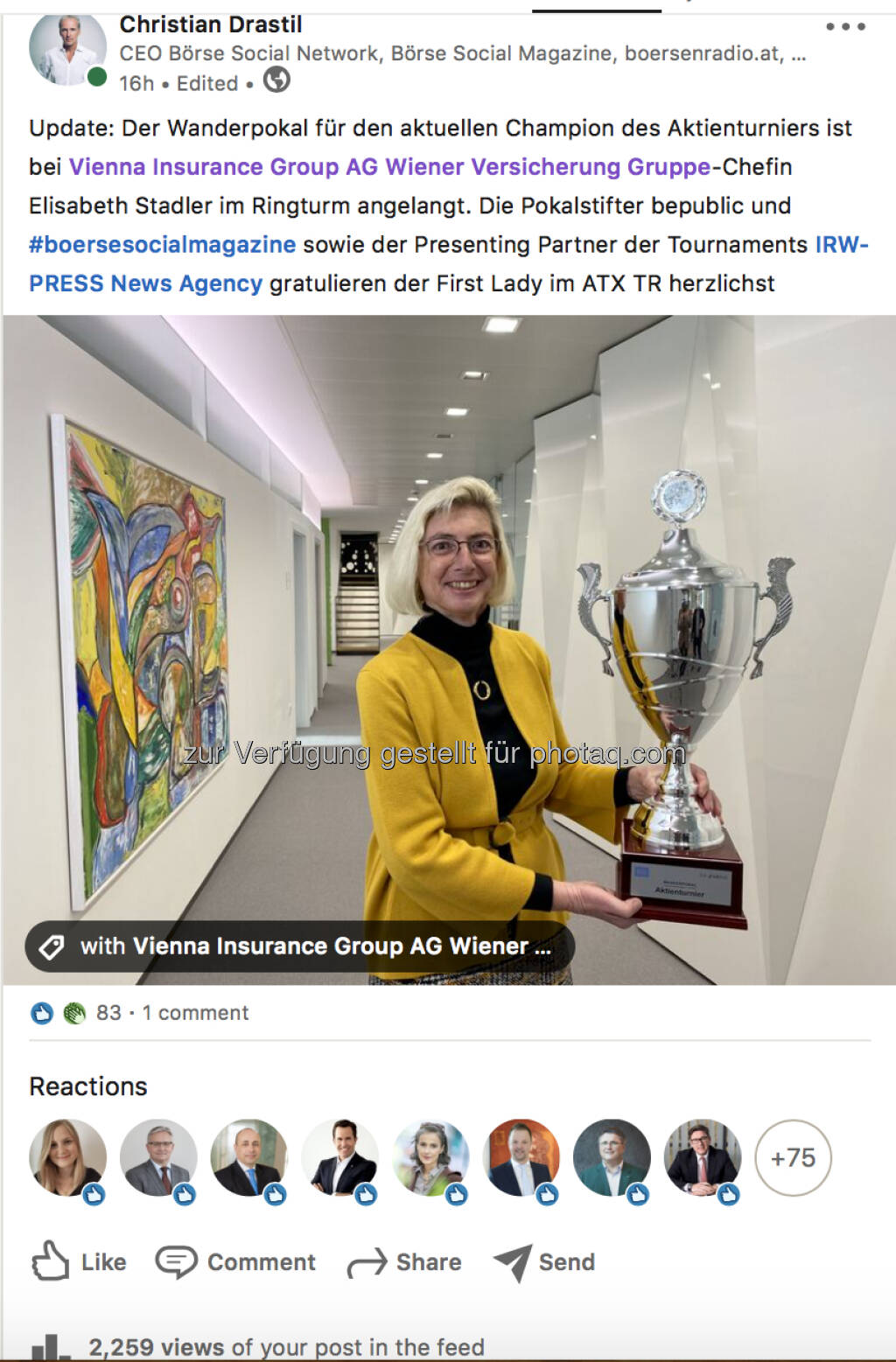 Ein feines Foto haben wir gestern von der VIG bekommen. Der Wanderpokal für den aktuellen Champion des Aktienturniers ist bei CEO Elisabeth Stadler im Ringturm angelangt. Die Pokalstifter bepublic und Börse Social Magazine sowie der Presenting Partner der Tournaments IRW-Press gratulieren der First Lady im ATX TR herzlichst. Mein Posting hat auf LinkedIn innerhalb von nicht einmal einem Tag mittlerweile 2500 Views (siehe links unten) erreicht. Das freut. Wie man den Wanderpokal für immer gewinnen kann: Entweder 100 Punkte in der Turnierrangliste http://www.boerse-social.com/tournament oder 3 Turniersiege (aktuell haben 6 Unternehmen je einen) oder 2 hintereinander. Da liegt beim nächsten Turnier im April der Ball bei der VIG ...