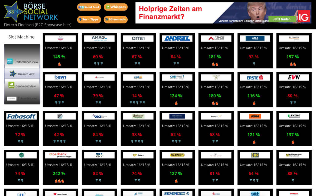 Ein Vorboten-Screenshot unserer neuen Wien-Ansicht boerse-social.wien. Hier sieht man zB bei der Slot Machine links oben die Umsätze 2016 vs. 2015 eingestellt. Wer hat mehr durchschnittliche Tages-Handelsumsätze als im Vorjahr? Weitere Slot-Machine-Einstellungen werden zB die Übersicht nach Zertifikaten zum Underlying sein (Deutsche Bank AG 1. fixer Emittent), dann zum wikifolio.com-Sentiment, dann zu den Präsentationen in unserer virtuellen Messe, und und und ... alles in stabilem Layout und immer neu einstellbar. Freu mich drauf!