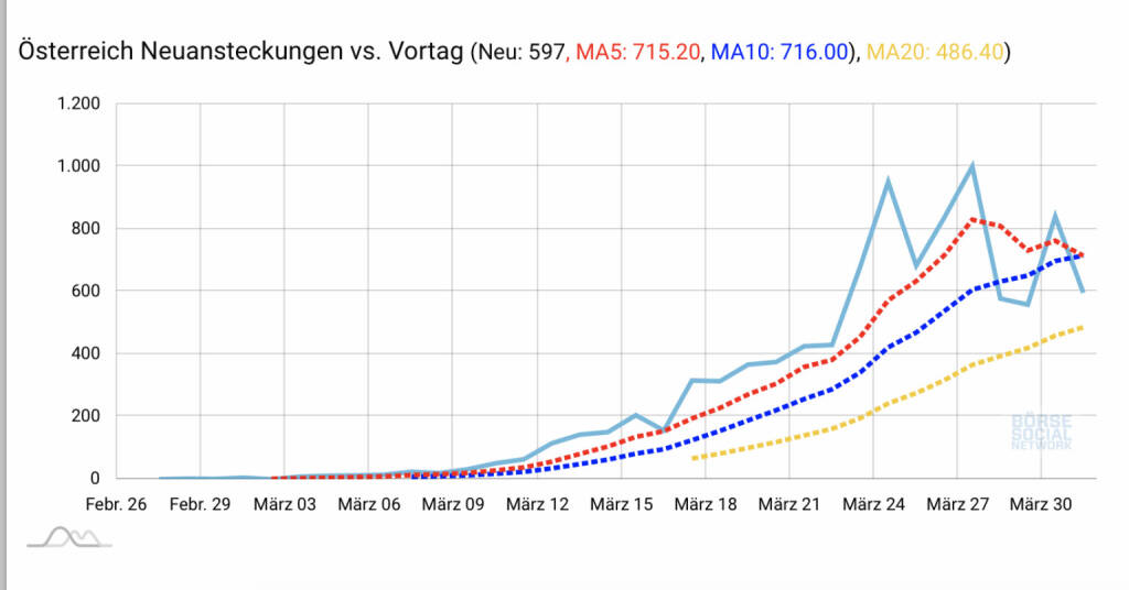 About: Im Börse Social Covid 19 Monitor, siehe https://www.boerse-social.com/covid19 , sehen wir uns täglich für Österreich gesamt und die 9 Bundesländer drei Charts an: Infektionen gesamt, Neuansteckungen absolut und in Prozent. Täglich aktualisiert basierend auf den 15:00-Werten von info.gesundheitsministerium.at